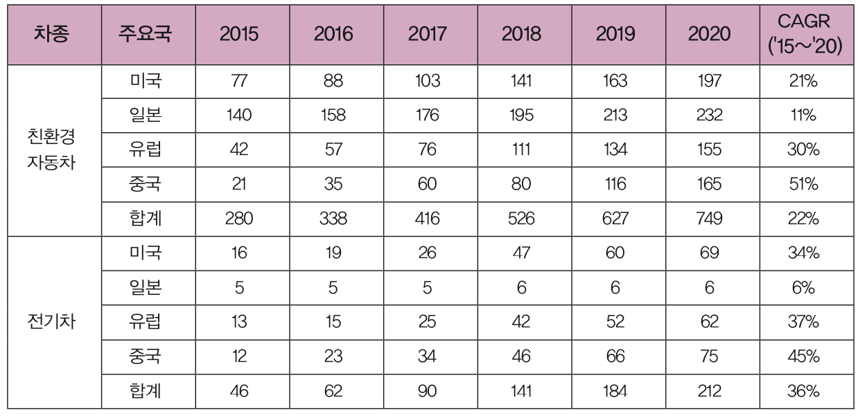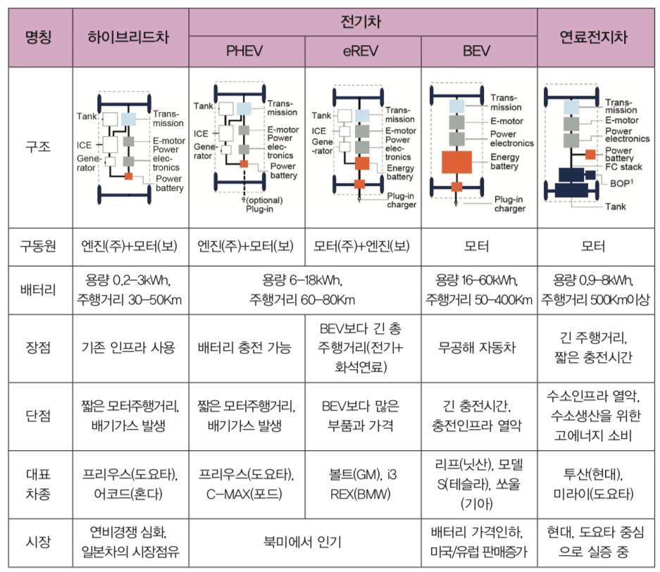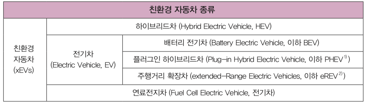 친환경 자동차는 화석 연료를 사용하지 않거나 최소화하여 무공해 또는 저공해 기준을 충족하는 자동차를 말한다. 친환경 자동차의 범위는 ‘환경친화적 자동차의 개발 및 보급 촉진에 관한 법률’ 제2조에 명시된 차로 전기차, 태양광차, 하이브리드차, 연료전지차, 천연가스차 또는 클린디젤차인데 이중 전기를 동력으로 사용하는 친환경 자동차는 하이브리드차, 전기차, 연료전지차로 분류되며, 전기차는 배터리 전기차, 플러그인 하이브리드차, 주행거리 확장 차로 세분화된다.