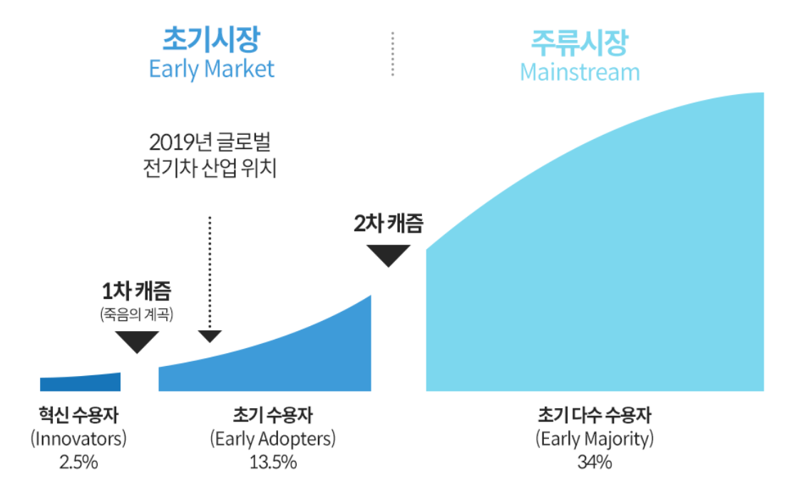 새로운 기술이나 제품이 시장에 출시되어 처음에는 잘 팔리는 듯하다가, 대중적으로 보급되기까지 수요가 정체되는 시기가 있다. 이를 ‘캐즘(Chasm)’ 또는 ‘죽음의 계곡(Death valley)’이라 부르는데, 출시된 지 이미 130년이 지난 지금까지도 전기자동차는 ‘초기 캐즘’의 깊은 수렁에 빠져 있었다. 그러나 포스코 경영연구원 박재범 수석연구원에 따르면, 올해는 전기차가 죽음의 계곡에서 빠져나오는 원년이 될 것으로 전망한다. 소형 전기자에 대한 높은 관심 덕이다.