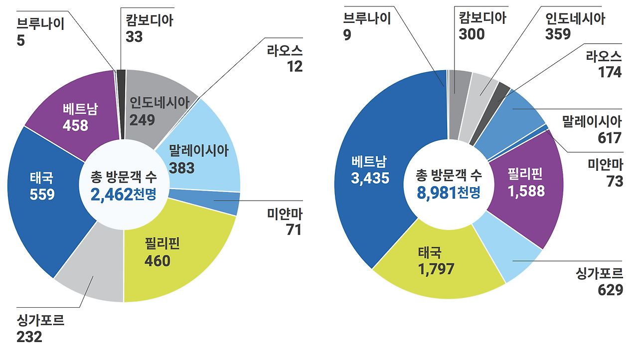 2018년 한국을 방문한 아세안 관광객 수(좌)와 아세안을 방문하는 한국인 관광객 수 (천 명)