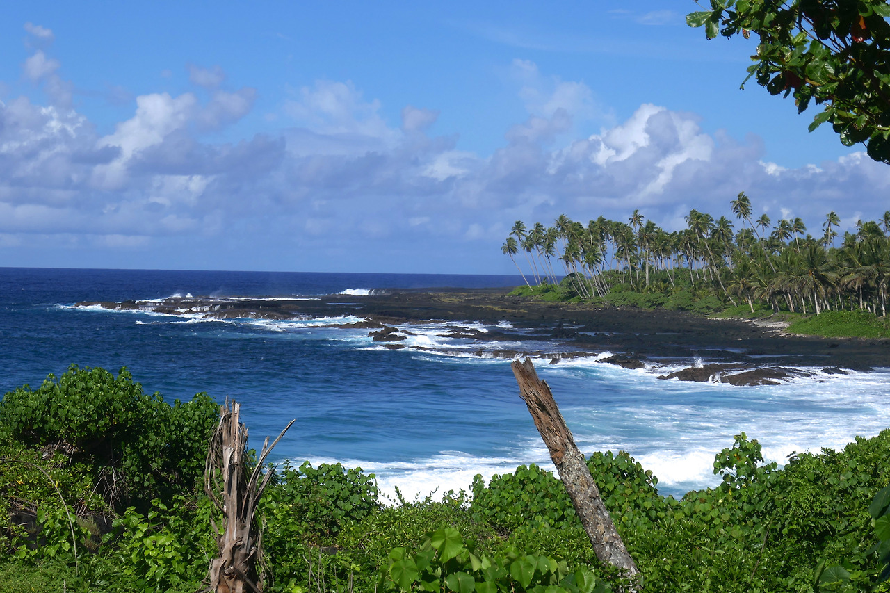 매력적인 사모아의 해안도로. 검은 화산암에 흰 포말이 일고, 야자수가 그 주위를 감싸고 있다.