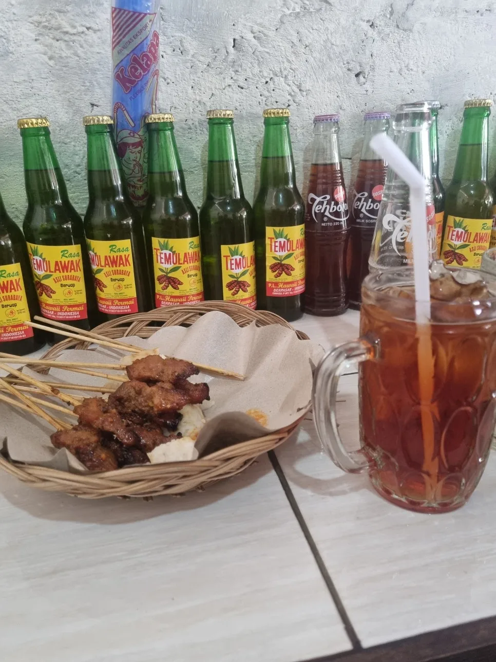 금방 불에서 구워진 사테(인도네시아 꼬치 요리) 열기를 모락모락 피어오르게 한다.