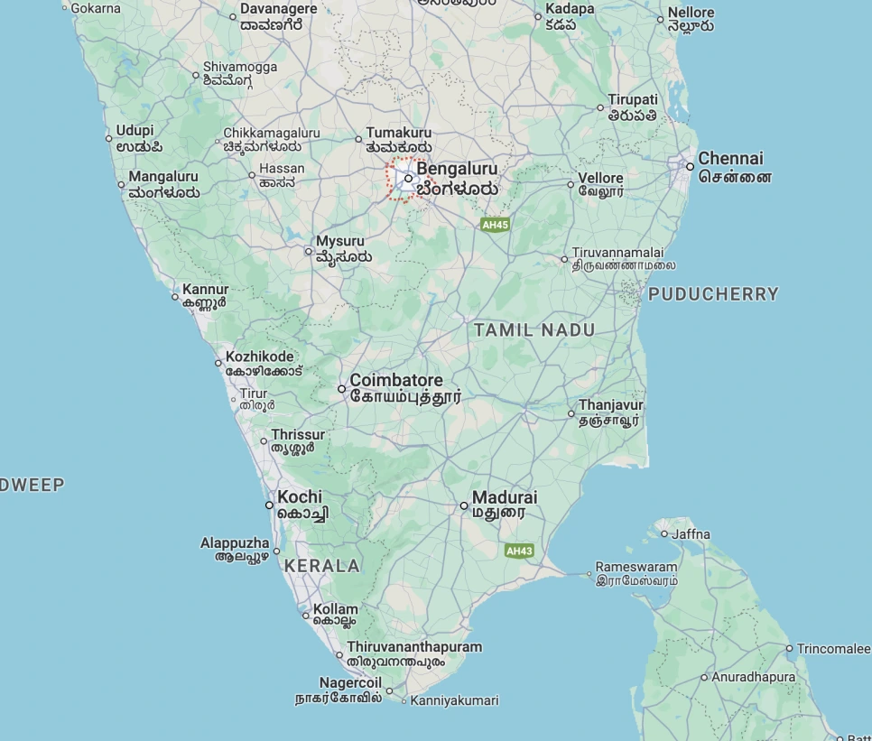 인도 남부에 위치한 대도시, 벵갈루루 (빨간색 표시)