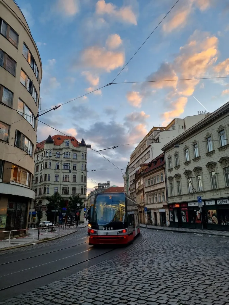 오래된 느낌의 빨간 트램이 프라하의 새벽 공기를 감싼다.