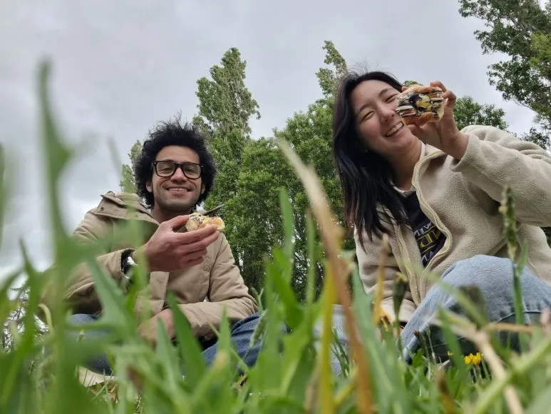 남아메리카 작은 마을 푸에르토나탈레스 잔디밭 돗자리에 함께 모여든 이 순간,