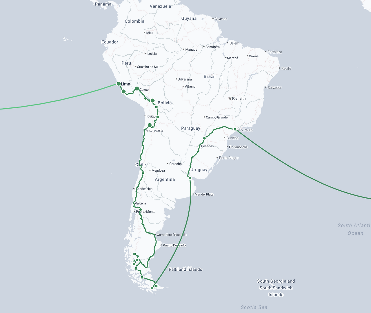 브라질(4일), 아르헨티나 (14일, 9일+5일), 칠레(14일, 7일+7일), 볼리비아(9일), 페루(10일)