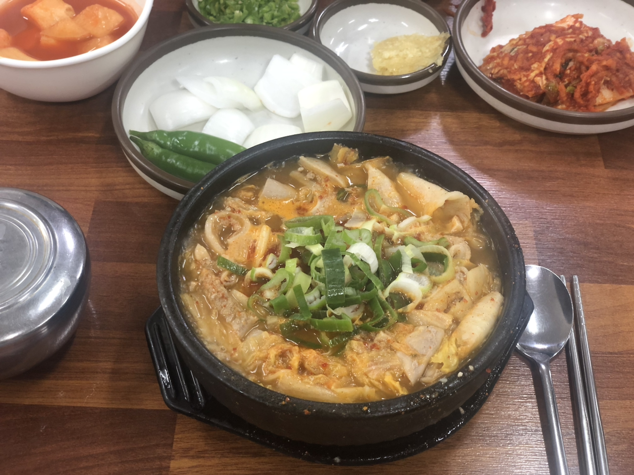 숙소 체크아웃 후에 아침 식사하러 온 산지해장국은 제주 시내에서 정말 맛있는 곳이다. 작년에 같이 놀러 온 직장동료와 함께 먹었던 해장국집인데 맛있어서 이번에 또 짝꿍과 재방문했다. 여기도 유명한 맛집이어서 아침 8시에 가도 항상 대기줄이 긴 곳인데 웨이팅 긴 식당을 피하는 편인 내가 참고 기다릴 정도. 웨이팅 30분 정도? 지난 뒤에 들어가면서 볼 것 없이 바로 주문한 내장탕. 뚝배기에 바글바글 끓어서 나온 푸짐한 비주얼에 이 날도 감동. 먹어도 먹어도 끝이 없어 보이는 알찬 재료와 시원 칼칼한 국물이 아주 맛있었다.
