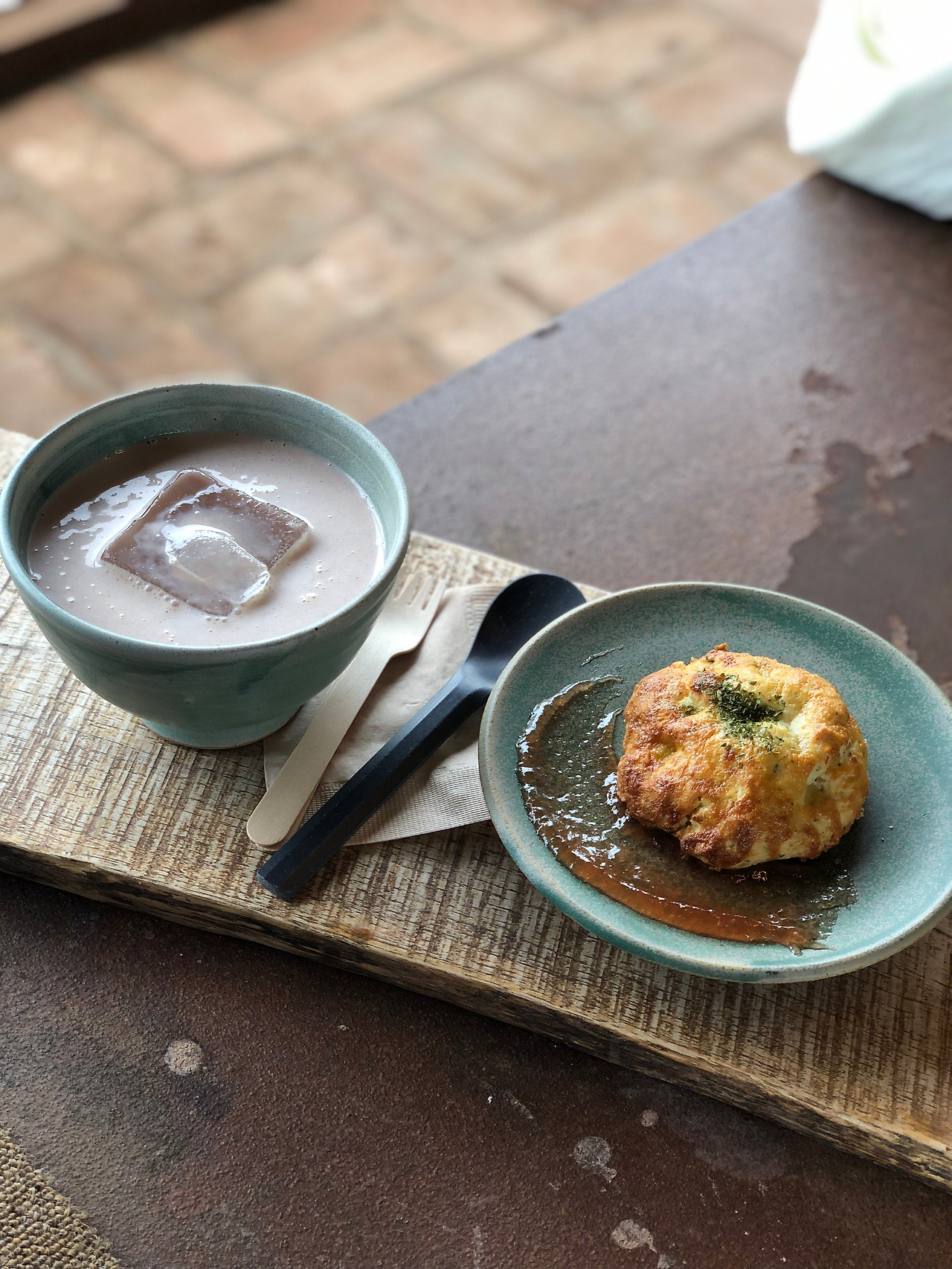 내가 주문한 마늘스콘과 보리개역. 보리개역은 워낙에 시그니처 메뉴로 유명해서 (카페인 충전하러 간 것을 까맣게 잊고ㅋㅋ) 주문했고, 마늘스콘은 그냥 맛있을 것 같아서 주문했다. 근데 오잉? 마늘스콘 진짜 맛있었다. 겉바속촉 스콘인데 은은한 마늘향과 달콤한 맛이 잘 어우러졌다. 먹다가 살구잼? 사과잼? 도 같이 발라먹었는데 완전 꿀맛. 약간 퍽퍽하다 느낄 때쯤 보리개역을 사발채로 드링킹.(저 수저는 너무 얕다구!) 어렸을 적 한여름에 엄마가 타 준 미숫가루에 왕얼음 하나 동동 띄워 먹는 것 같았다.