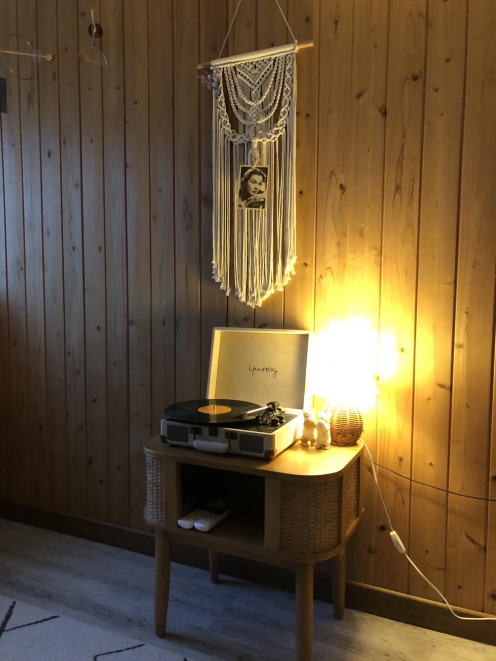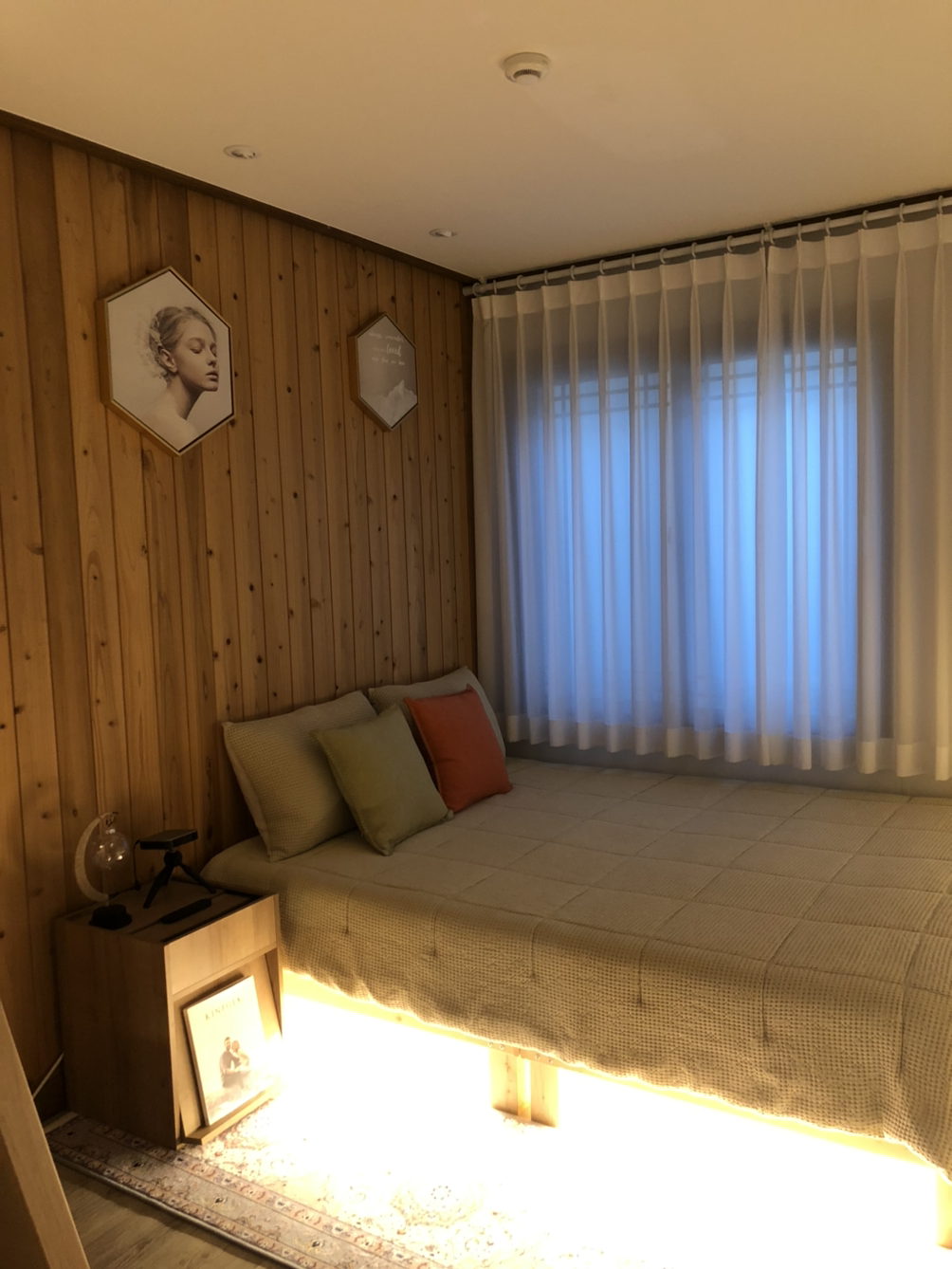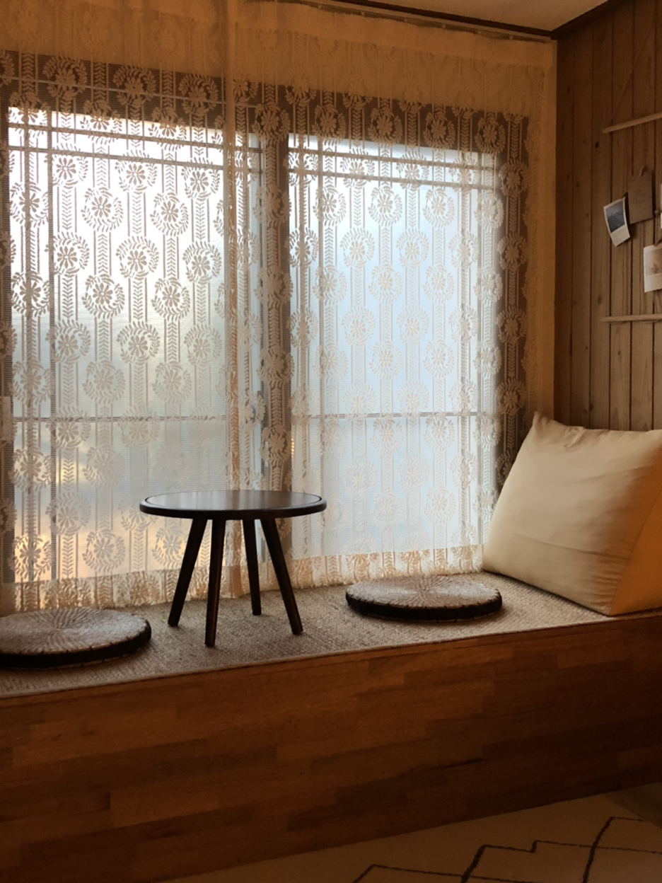 실내로 들어오게 되면 이렇게 마주 보고 앉아서 쉬거나 음식을 먹을 수 있는 평상이 있고, 벽 한쪽 켠에는 바이닐을 들을 수 있는 턴테이블도 마련되어 있었다. 그리고 맞은편에는 편히 잘 수 있는 침대와 행거가 있는 침실이 있고, 방에서도 미니 빔프로젝터를 이용해 유튜브나 넷플릭스를 볼 수 있었다. 나는 주로 저녁에 유튜브 플리를 틀어놓고 혼자 뒹굴거렸는데, 글을 쓰면서 생각나는 그 여유로웠던 밤들이 너무 그립다.