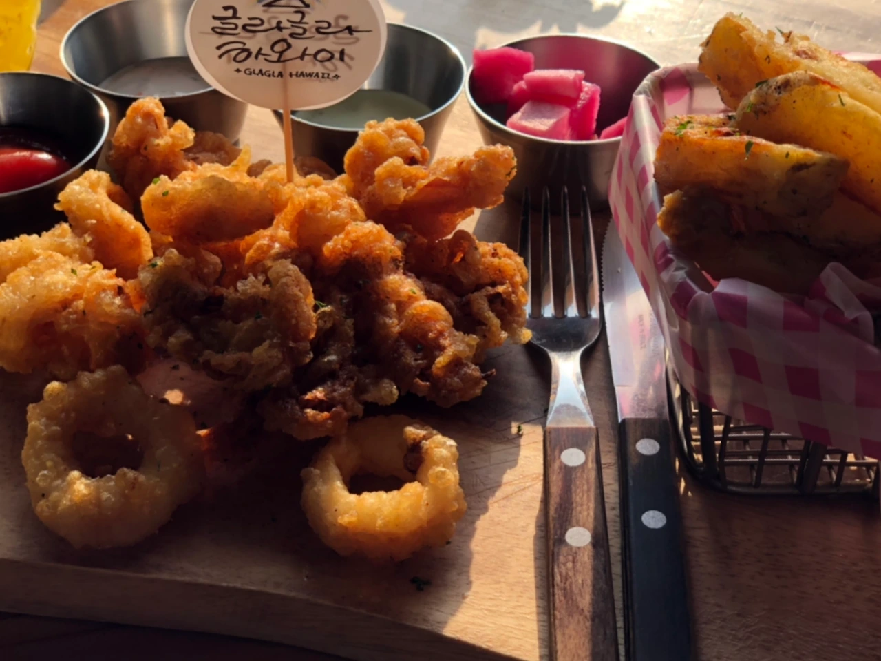 이대로 숙소로 들어가긴 아쉬워, 이른 저녁식사 겸 근처 모슬포항에 '글라글라하와이'라는 피시 앤 칩스 맛집으로 들렸다. 이름에서부터 느껴지는 하와이 스피릿. 매장 음악도 우쿨렐레 소리가 아름다운 노래를 틀어서 잠시 하와이에 온 듯한 착각이 들었다. 내가 주문한 메뉴는 한치 피시 앤 칩스랑 제주청귤에이드. 역시 바닷가에서는 피시 앤 칩스를 먹어줘야 한다. 피시 앱 칩스를 먹으니 해변에 놀러 온 체감이 배가되었다.