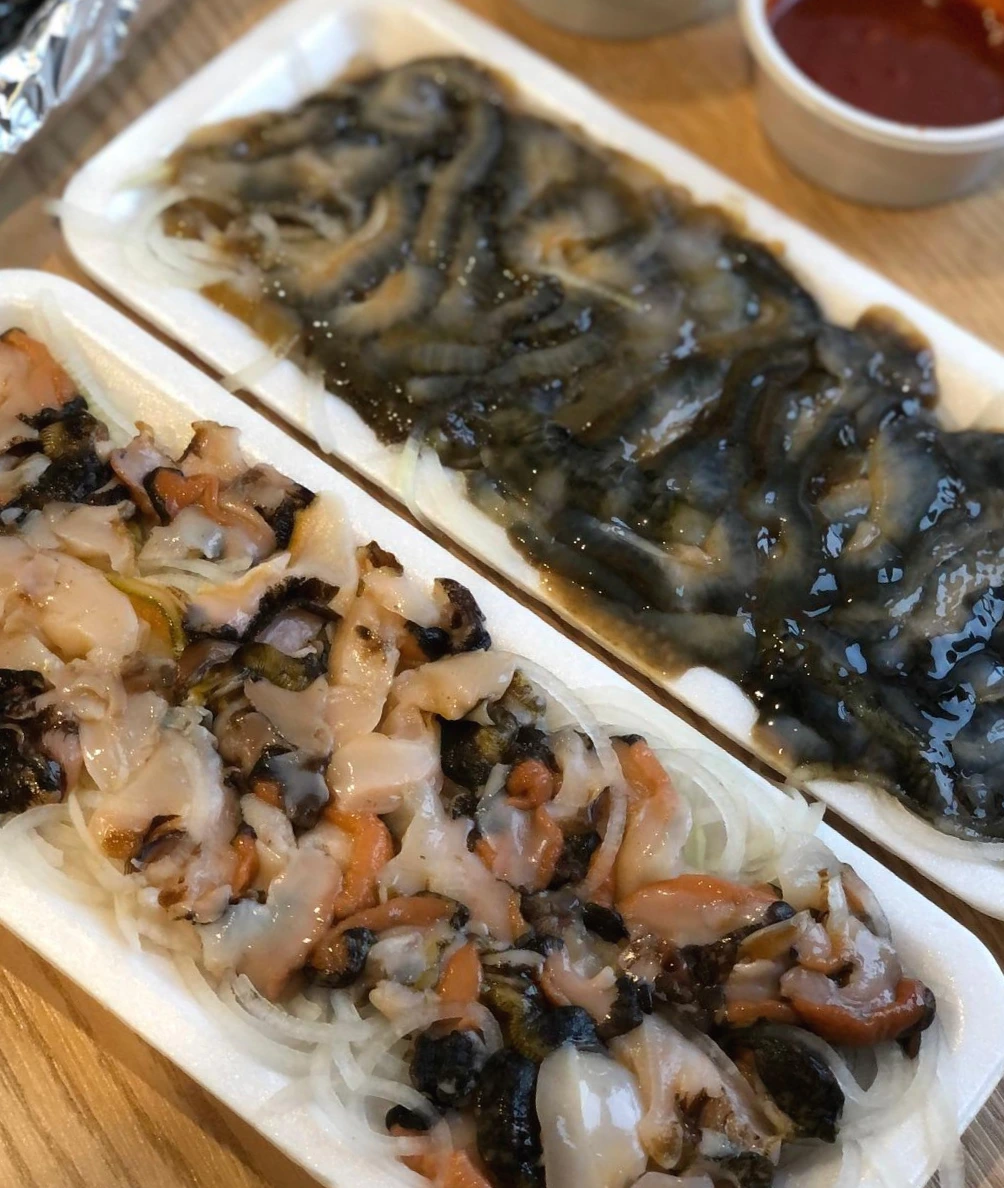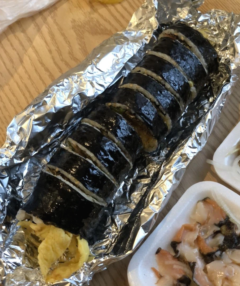 호텔에 빠르게 주차 한 뒤 이 날도 저녁거리를 사러 올래시장을 방문했다. 여행객들이 몰리기 전에 유명한 '우정회센타'와 '다정이네 김밥'으로 저녁메뉴 픽! 예전에 '우정회센타'에서 먹었던 뿔소라가 너무 맛있었어서 이번에도 뿔소라+해삼 조합으로 포장해왔다. (6시가 되기 전에 일찍 간다고 갔는데 역시나 사람들이 많았다. 먹는 손님도 포장 손님도 문전성시다.) 그리고 제주 김밥으로 유명한 '다정이네 김밥'집에 혹시 몰라 슬쩍 들려보니 웨이팅이 없는 거 같아 바로 매운 멸치 고추김밥 한 줄을 포장해왔다.