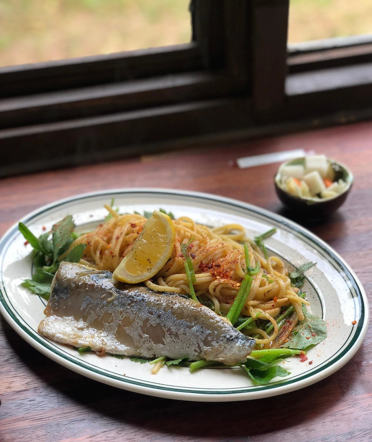 식당이 예뻐서 이곳저곳 사진 찍으며 한 20여분쯤 기다리다 보니 정성스러운 음식이 나왔다. 잘 구워진 고등어 한 덩어리와 쫄깃해 보이는 파스타. 향도 전혀 비릿하지 않았다. 레몬즙을 골고루 뿌리고 고등어 조각 한 입 먹었는데 세상에... 너무 부드러웠다. 이렇게 부드럽고 기름진 고등어는 간만이었다. 그리고 바로 면 한 입 먹었는데 우려와 달리 생선 비린맛이 하나도 나지 않는 정말 맛있는 오일 파스타였다. 녹음이 푸릇푸릇한 곳에서 로컬 식재료로 건강한 음식을 먹으니 건강해지는 느낌이 절로 들었다. 제주에 같다면 두 번 세 번 방문하고 싶은 곳. 고사리 파스타도 있던데 다음엔 이걸 도전해보겠어.