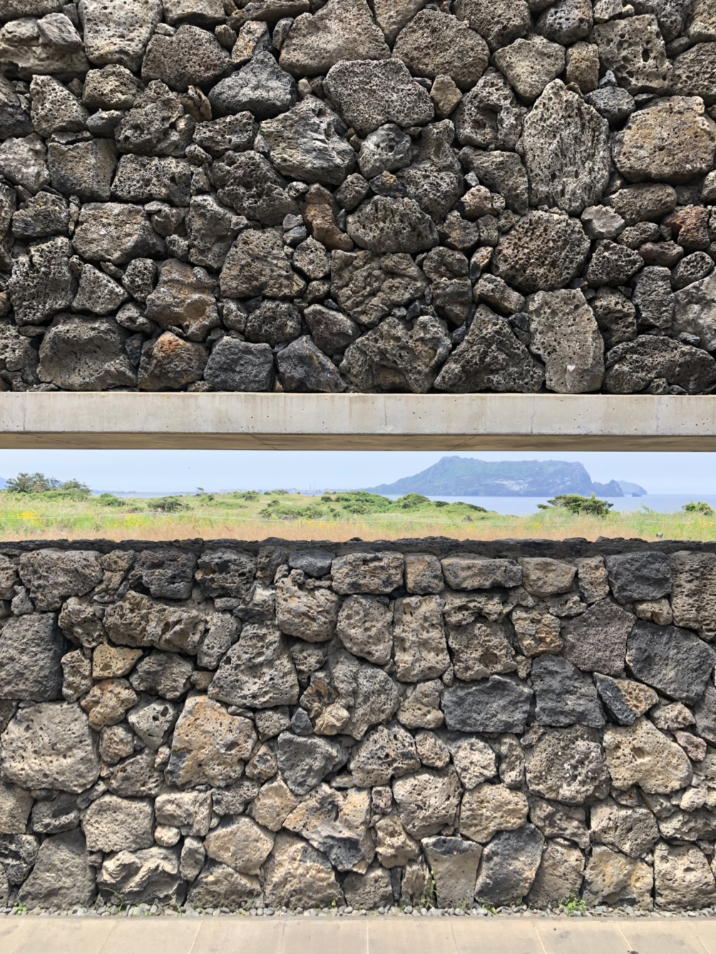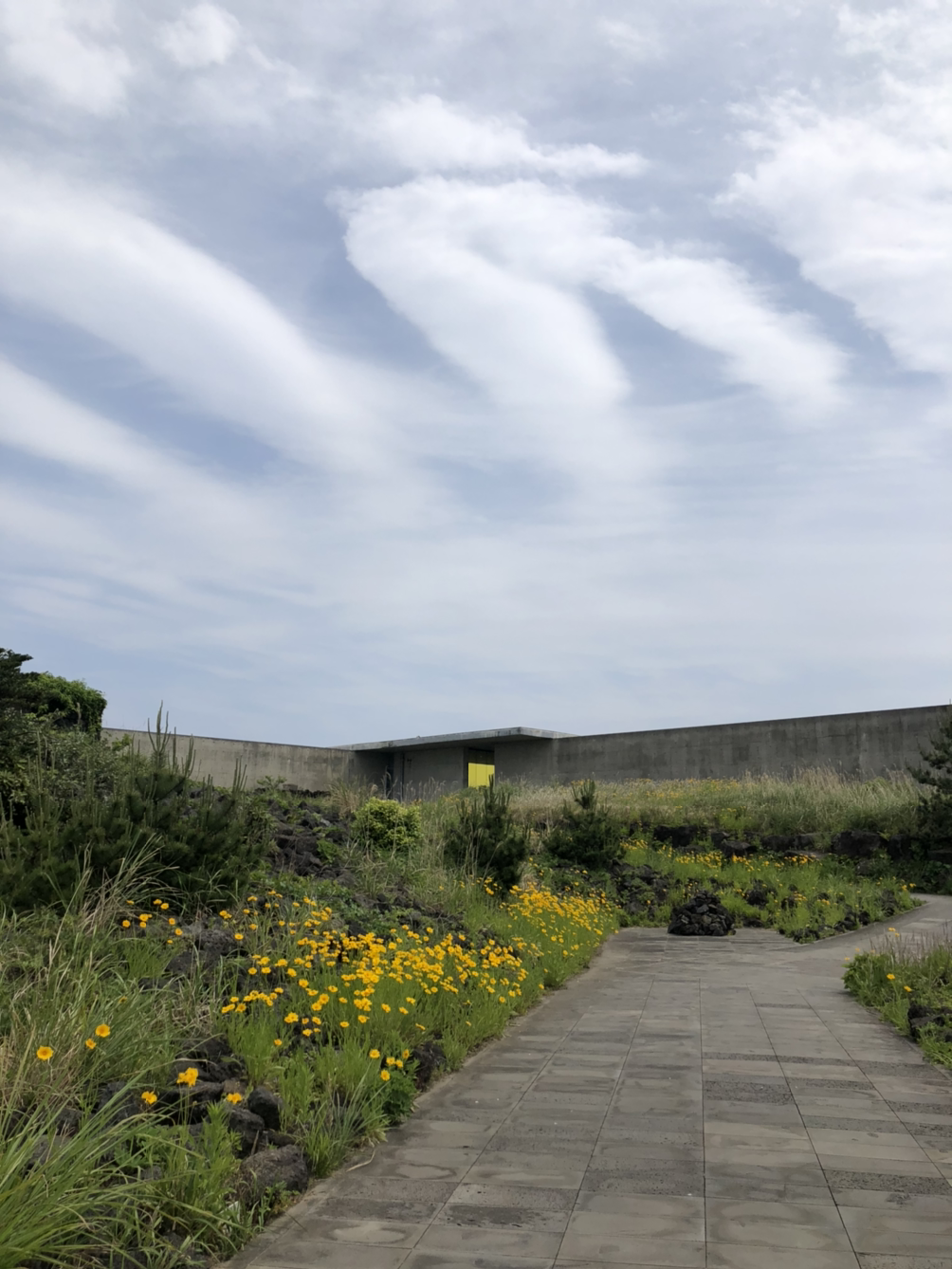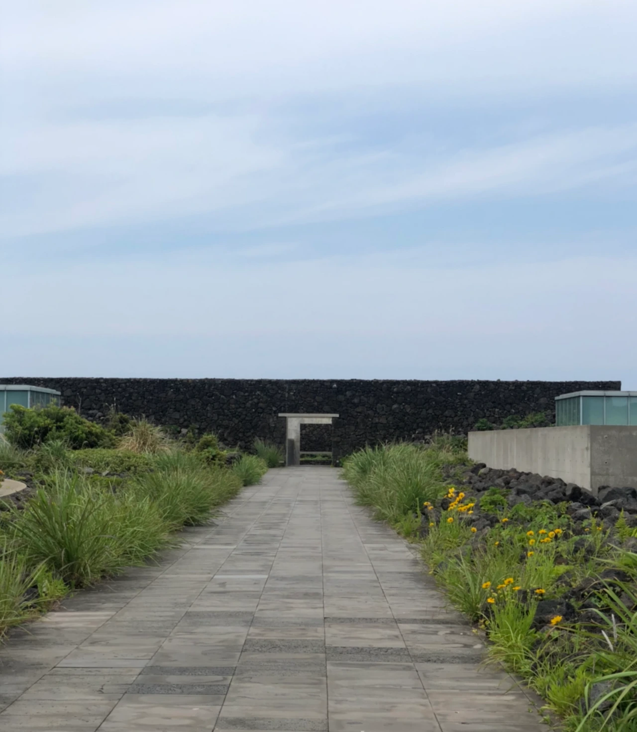 미리 온라인 예매를 하고 방문한 유민미술관은 섭지코지 내에 위치한 미술관인데, 일본 오사카 출신의 안도 타다오의 건축물로도 유명하다. 노출 콘크리트 건축물 사이로 제주의 바람과 빛, 소리를 느낄 수 있게 만든 공간이라고 하는데, 제일 장관인 점은 정면 돌담에 작게 난 창쪽으로 관람객이 다가갈수록 바다 풍경이 보이기 시작하면서 제일 가까이 창 앞에 다가섰을 때 성산일출봉이 보이도록 한 것이다. 가까이 다가가면 보이는 창 너머의 성산일출봉이 액자 프레임에 그려진 한 폭의 그림같이 장관이었다.