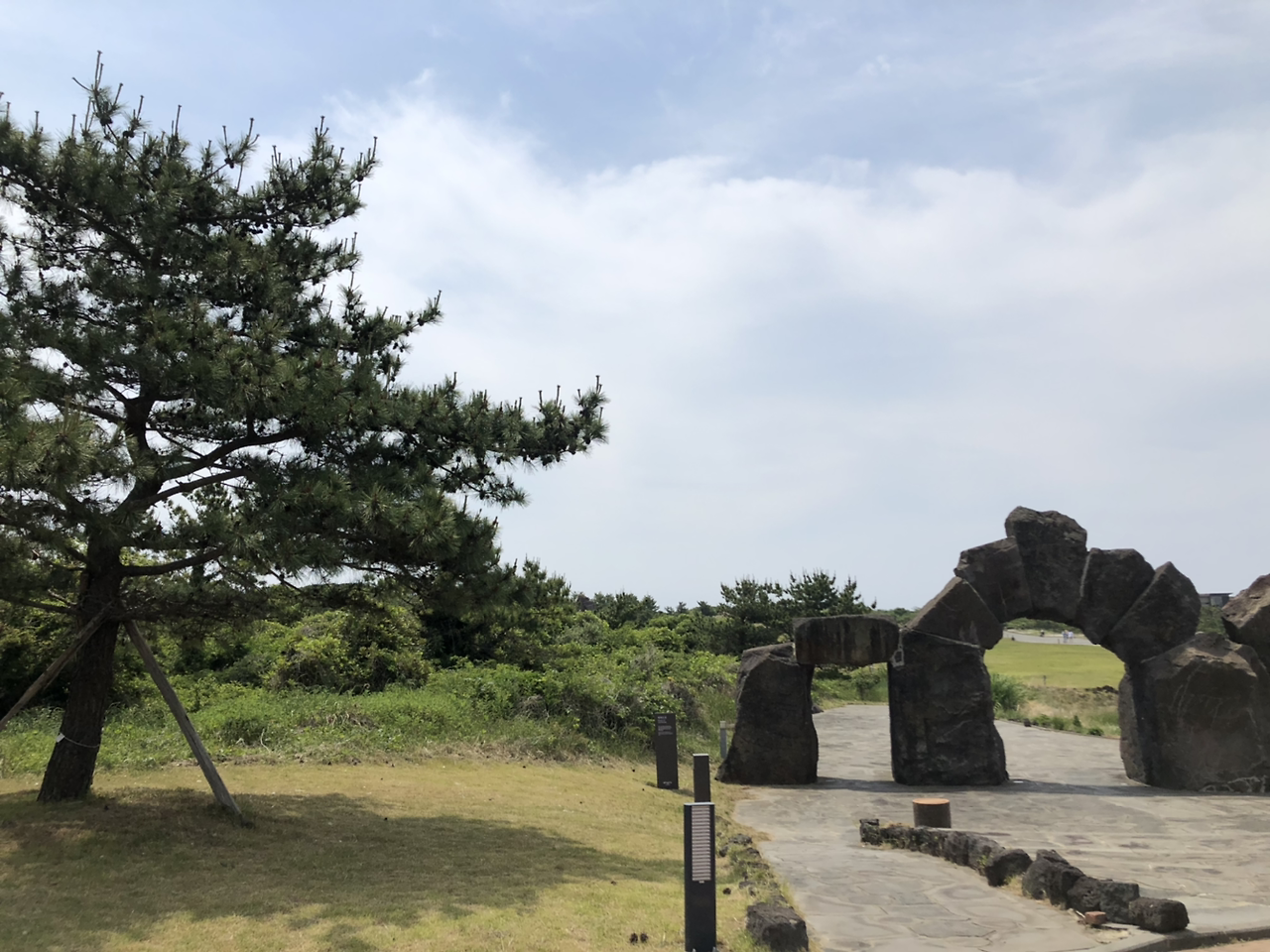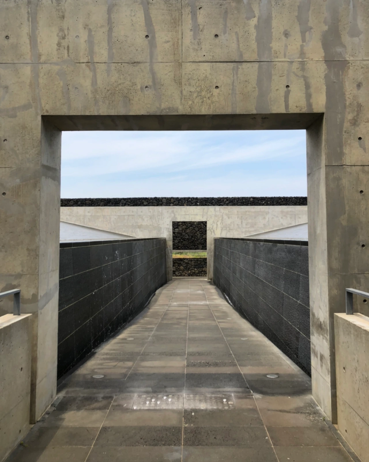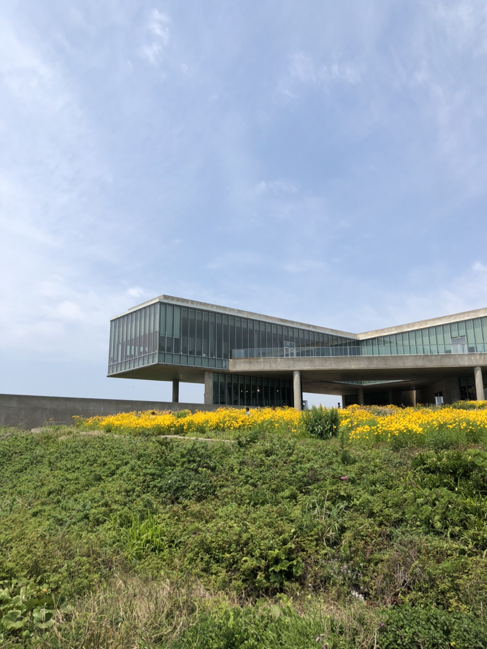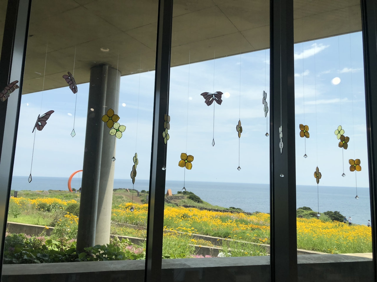 미리 온라인 예매를 하고 방문한 유민미술관은 섭지코지 내에 위치한 미술관인데, 일본 오사카 출신의 안도 타다오의 건축물로도 유명하다. 노출 콘크리트 건축물 사이로 제주의 바람과 빛, 소리를 느낄 수 있게 만든 공간이라고 하는데, 제일 장관인 점은 정면 돌담에 작게 난 창쪽으로 관람객이 다가갈수록 바다 풍경이 보이기 시작하면서 제일 가까이 창 앞에 다가섰을 때 성산일출봉이 보이도록 한 것이다. 가까이 다가가면 보이는 창 너머의 성산일출봉이 액자 프레임에 그려진 한 폭의 그림같이 장관이었다.