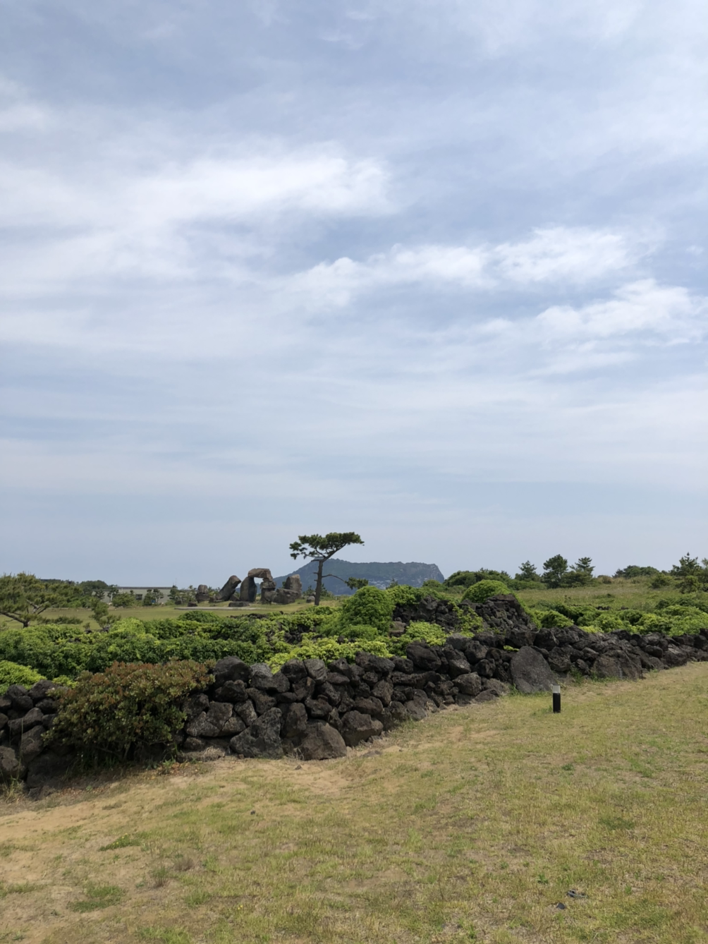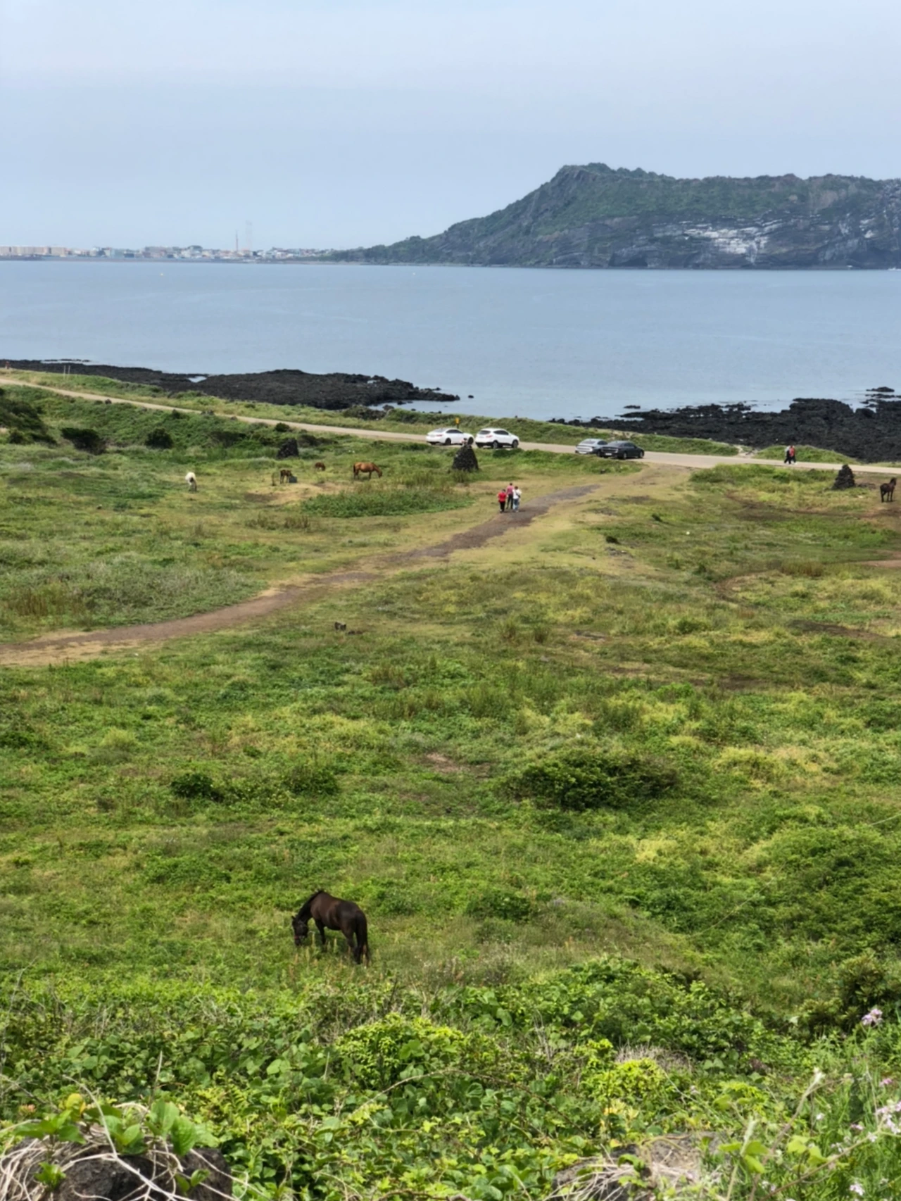 글라스 하우스를 나와서 또다시 걷다 보니 언덕 아래로 성산일출봉이 가까이 보이고, 풀을 뜯는 말 친구들도 보였다.