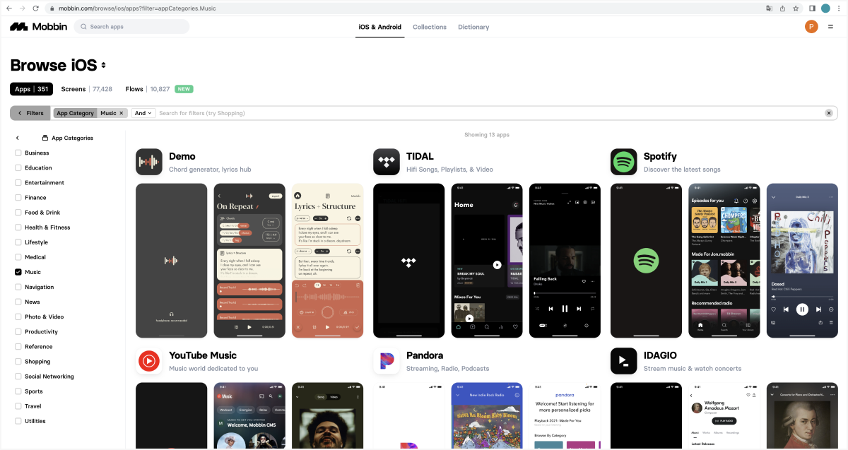 Mobbin에는 실제 사용되는 해외의 앱들을 각 분야별로 카테고리로 볼 수 있다. 또한 모든 화면 디자인뿐만 아니라, Flow Tree로 플로우별로 디자인을 볼 수 있다. 국내에는 WWIT가 있지만 상대적으로 앱 목록이 적다. 앱스토어에는 수없이 다양한 앱들이 있으며 내가 디자인해야 할 서비스의 카테고리 안에도 수천수만의 앱들이 있다. 하지만 화려한 콘셉트 디자인에 비해 다소 익숙하고 재미없게 느껴지는 기존의 앱들은 레퍼런스 참고에 있어 소외받는 경우가 많다.