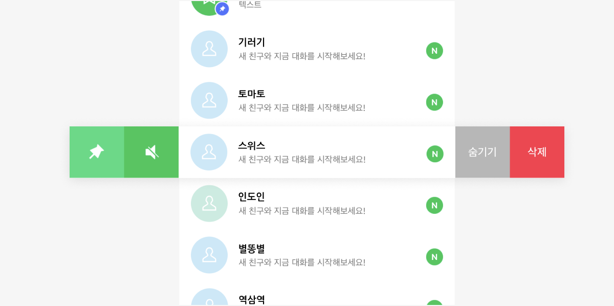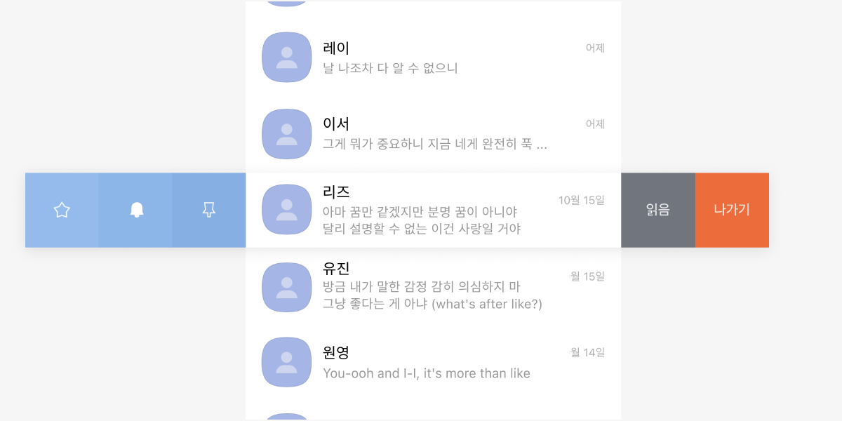 채팅창에서 좌우로 스와이프 했을 때 나오는 기능들 또한 비슷하면서 다르다. 카카오톡은 우측 스와이프 시 즐겨찾기와 알림 및 고정이 있고, 좌측 스와이프 시 읽음 및 나가기가 있다. 라인은 우측 스와이프 시 고정 및 알림으로 즐겨찾기가 빠져있다. 좌측 스와이프 시 읽음이 없고 숨기기가 있다.