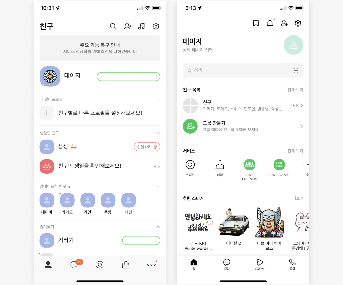 기존의 대화가 없는 사람과 채팅을 하는 경우 카카오톡은 메인화면에 친구 리스트가 있어, 메인화면에서 바로 원하는 친구를 선택하여 채팅을 할 수 있다. 반면 라인의 경우 친구 목록에 들어간 이후 친구 리스트가 보이기 때문에 한 개의 뎁스가 더 추가된다. 이러한 측면에서 봤을 땐 카카오톡이 조금 더 편의성이 좋다 생각한다. 메인화면 검색창을 해도 되긴 하지만, 직접 타이핑으로 이름을 검색하는걸 더 번거롭게 느낄 수 있다.