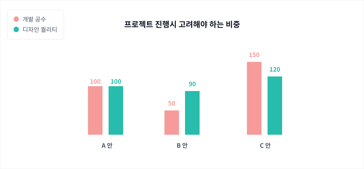 A안이라는 구조의 디자인을 하면 높은 편리성으로 유저의 편의성이 100이지만 개발 또한 복잡해서 100이라는 공수가 생긴다. 반면 B안의 구조는 디자인에서 약간의 편의성이 떨어져 90이지만 개발이 상대적으로 쉬워 50이라는 공수가 생긴다면 어떤 디자인을 하는 게 맞을까?