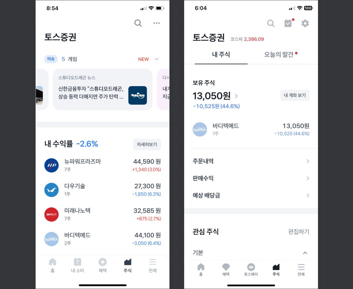 주식 구조 변화: 수익률만 보이고 '자세히 보기'버튼을 통해 보유 주식의 총 손익금액을 볼 수 있었는데, 메인 화면에서 손익금액을 볼 수 있게 변경되었다. 가장 중요 요소 변화 '수익률' -> 보유 주식 '금액'