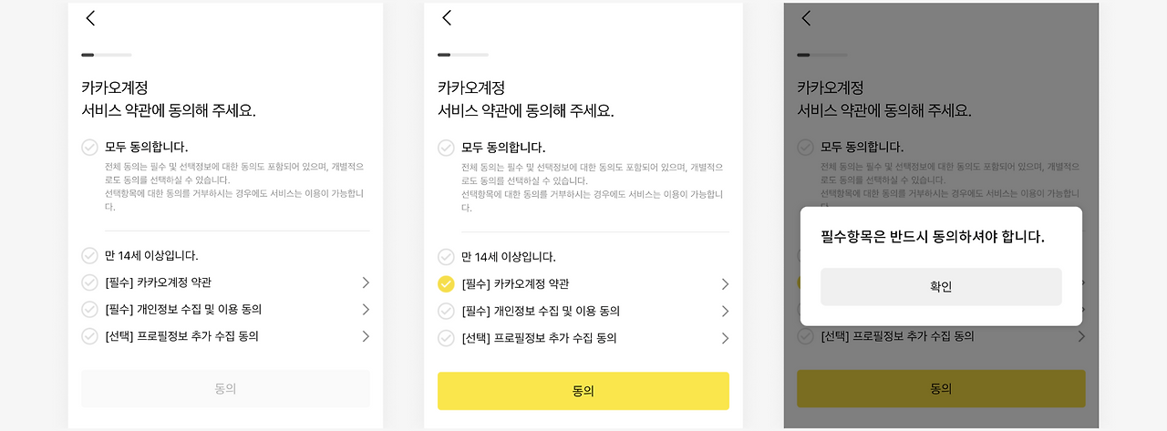 카카오 버튼의 경우에는 문제점이 있다. 바로 이 페이지의 문제점은 필수 항목 한 개만 체크를 해도 버튼이 활성화가 된다는 점이다. 이러한 변화는 사용자로 하여금 체크해야 하는 항목을 다 체크하였구나, 다음 단계로 넘어가도 되겠다는 생각을 들게 한다. 하지만 이 상태에서 필수 항목을 전부 체크하지 않은 상태에서 다음 단계로 넘어가려고 하면 필수 항목 동의 팝업이 뜨게 된다. 사용자는 다시 한번 나머지 필수 항목을 체크 후 버튼을 눌러야 한다. 직관적으로 다음 단계로 넘어갈 수 있을 거란 확신을 유저에게 주었지만, 다시 되돌아가야 한다. 즉 논리성이 맞지 않는다.