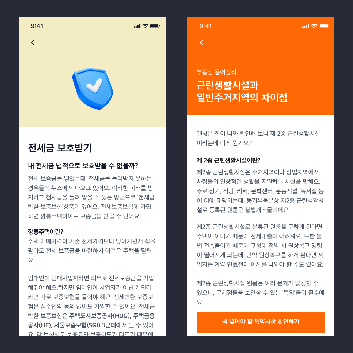 두 번째 아쉬운 점은 콘텐츠가 없다는 점입니다. 부동산 중개 앱은 판매하는 사용자(공인중개사)와 집을 구매 or 임대하려는 사용자를 연결해 주는 서비스입니다. 부동산이라는 재산에 관련된 서비스인데, 일반적인 사람들의 경우 이런 부동산에 관한 지식이 부족합니다. 특히 첫 자취를 나서는 대학생이나 사회초년생의 경우 부동산 거래 경험이 없기 때문에 더더욱 지식이 부족한 상태입니다. 자취방을 구하면서 느꼈던 점은 많은 부동산 중개 플랫폼이 있지만, 이러한 지식을 습득할 수 있는 콘텐츠나 자료 제공이 없다는 점이었습니다.