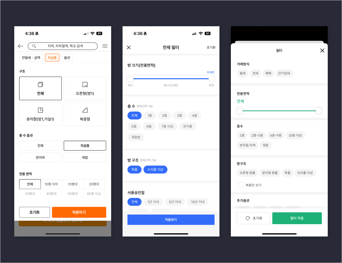 자취방을 구할 때 여러 조건들을 보게 되는데, 기피하는 조건 중 하나가 반지하입니다. 벌레와 습기 등 다양한 문제와 인식으로 인해 반지하는 추천하지 않고, 실제 매물 역시 반지하는 상대적으로 저렴합니다. 재정적인 여유가 없다면 어쩔 수 없지만 그런 경우가 아니라면 반지하는 피해서 매물을 찾아보는 사용자들이 많습니다. 이와 유사한 이유로 옥탑방도 기피하는 매물 중 하나입니다. 서비스들은 이러한 사용자의 경험을 바탕으로 필터링을 통해 반지하 또는 옥탑방을 제외할 수 있는 편의성을 제공하고 있습니다. 이런 층 수에 대한 정보뿐만 아니라, 전용 면적이 몇 평인지, 층수가 어떤지, 방 구조는 오픈형인지, 투룸인지 다양한 부분에서 필터링을 통해 원하는 집을 볼 수 있게 도와주는 기능을 하고 제공하고 있습니다.