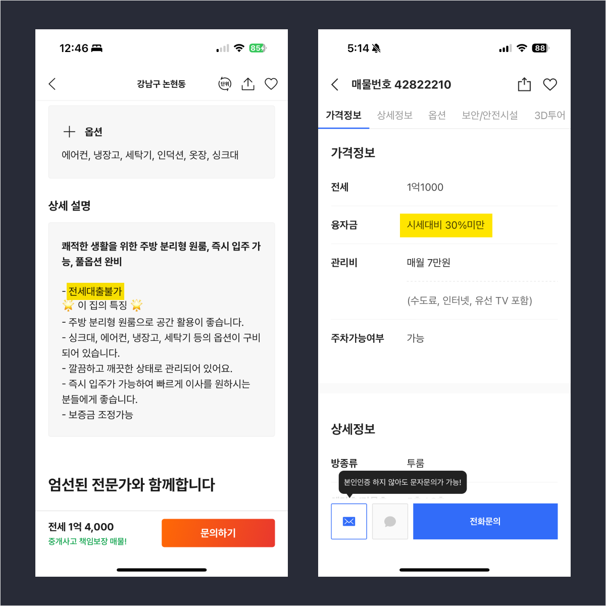 하지만 현재 부동산 서비스들은 이런 정보들은 필터링을 할 수 없으며 사용자가 직접 매물을 선택하여 매물에 대한 상세 설명에 기재되어 있는 내용을 확인해야지만 알 수 있는 구조입니다. 만약 상세 설명에도 없다면 직접 중개인에게 문의를 해야지만 알 수 있습니다. 이러한 구조는 사용자 입장에서 불편함을 느끼게 만든다 생각합니다. '전세사기가 불안한 사용자는 좋은 가격의 전세 매물이 올라와서 매물을 확인하여도 높은 비중의 융자금이 있다면 해당 매물을 기피할 것이다.'라는 유저 시나리오를 세운다면, 융자금 유무 및 비중의 필터링은 사용자들의 편의에 도움을 줄 수 있을 것입니다. 전세사기 공포 확산에 "집주인 융자 많으면 안 찾아요" 관련 뉴스 기사