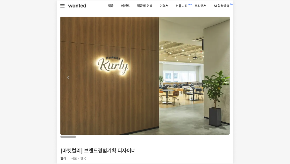 원티드의 채용공고에는 상단에 큰 이미지로 배너가 돌아간다. 여러 이미지가 들어갈 경우 좌우측에 스와이프 할 수 있는 <> 버튼이 있어서 해당 버튼을 누를 시 다른 이미지를 볼 수 있다.