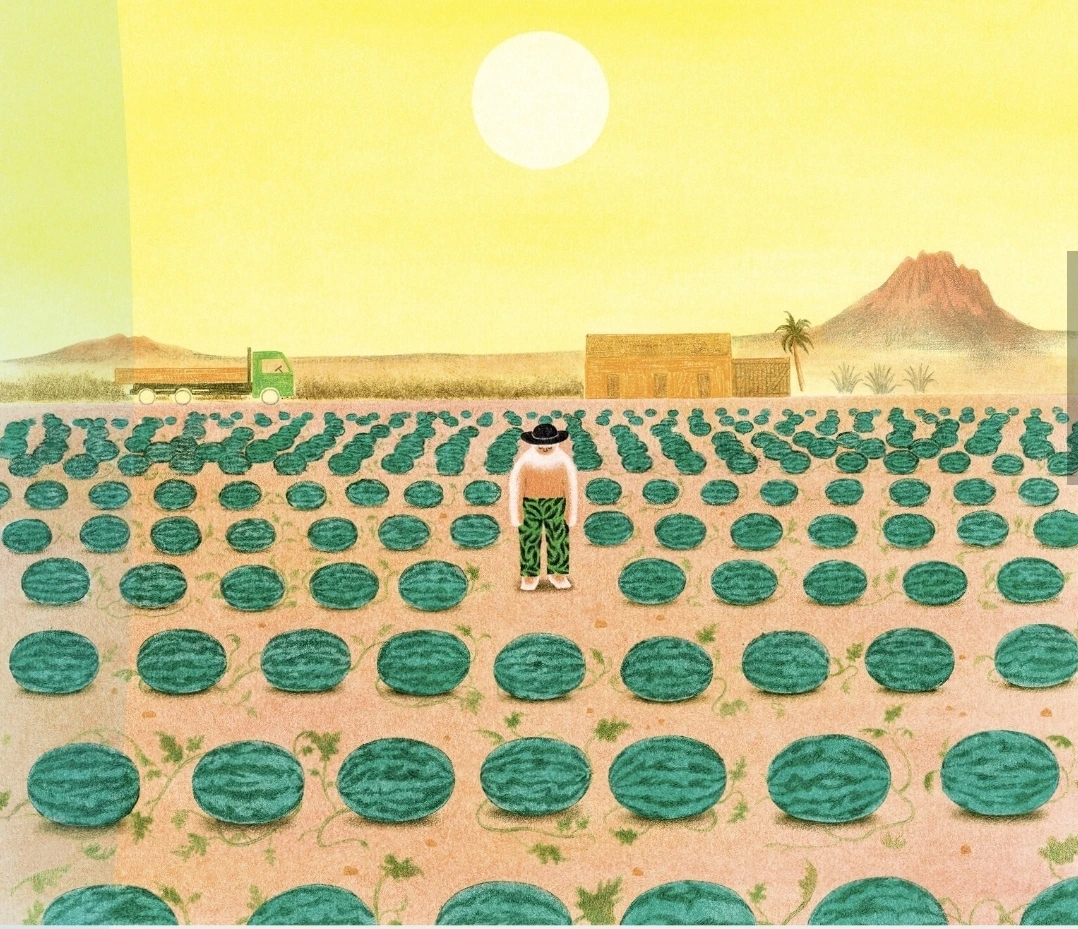 앙통은 꿈에서 수박 하나가 목화밭으로 굴러가는 것을 보곤 잠이 확 깨서 목화밭으로 달려간다. 사라진 수박을 찾는 미스터리 장르에다 목화밭이라는 엉뚱한 단서를 더하며 독자를 혼란에 빠뜨린다. 그림책으로서는 매우 영악하고 드문 서술이었다.