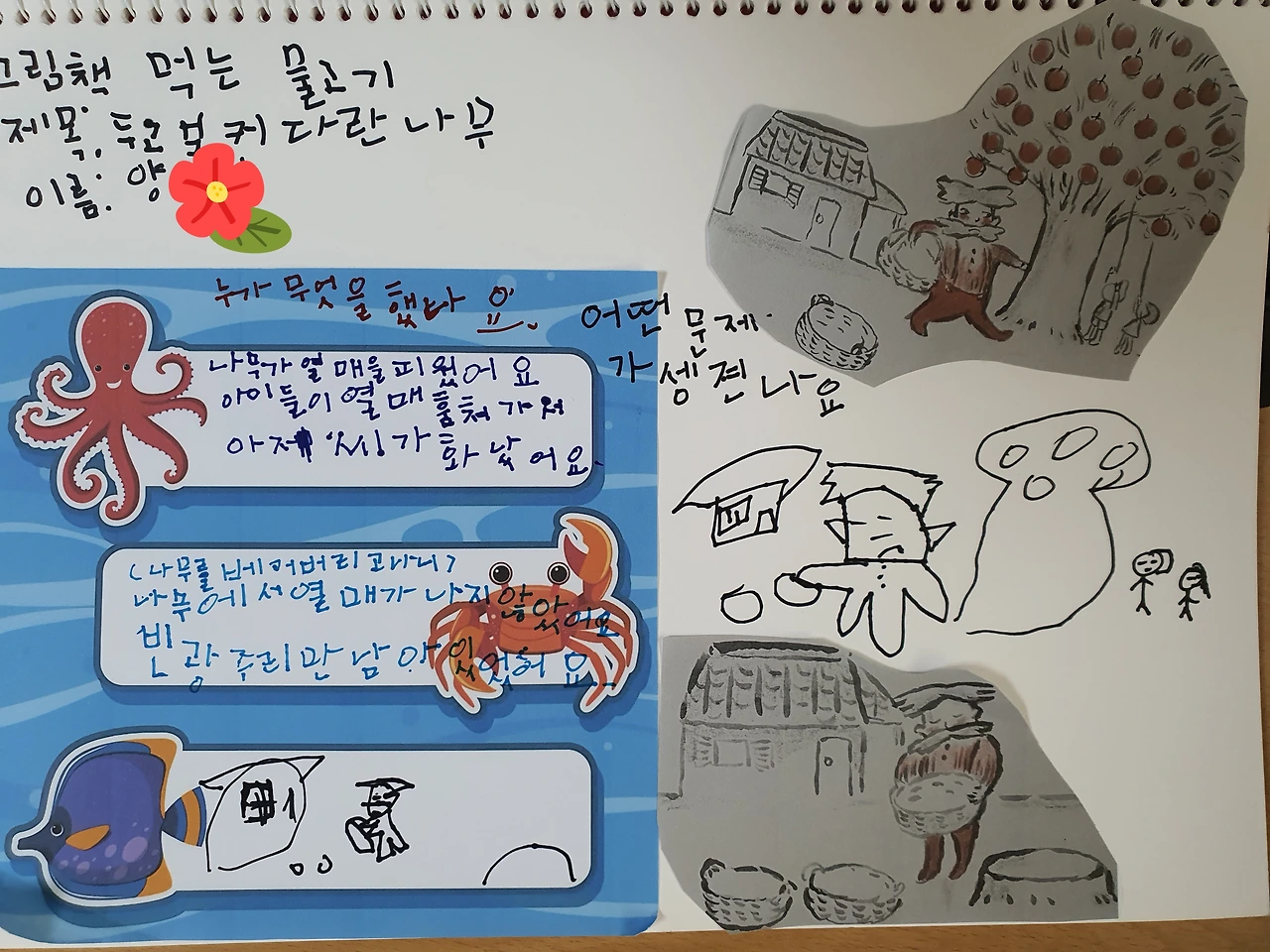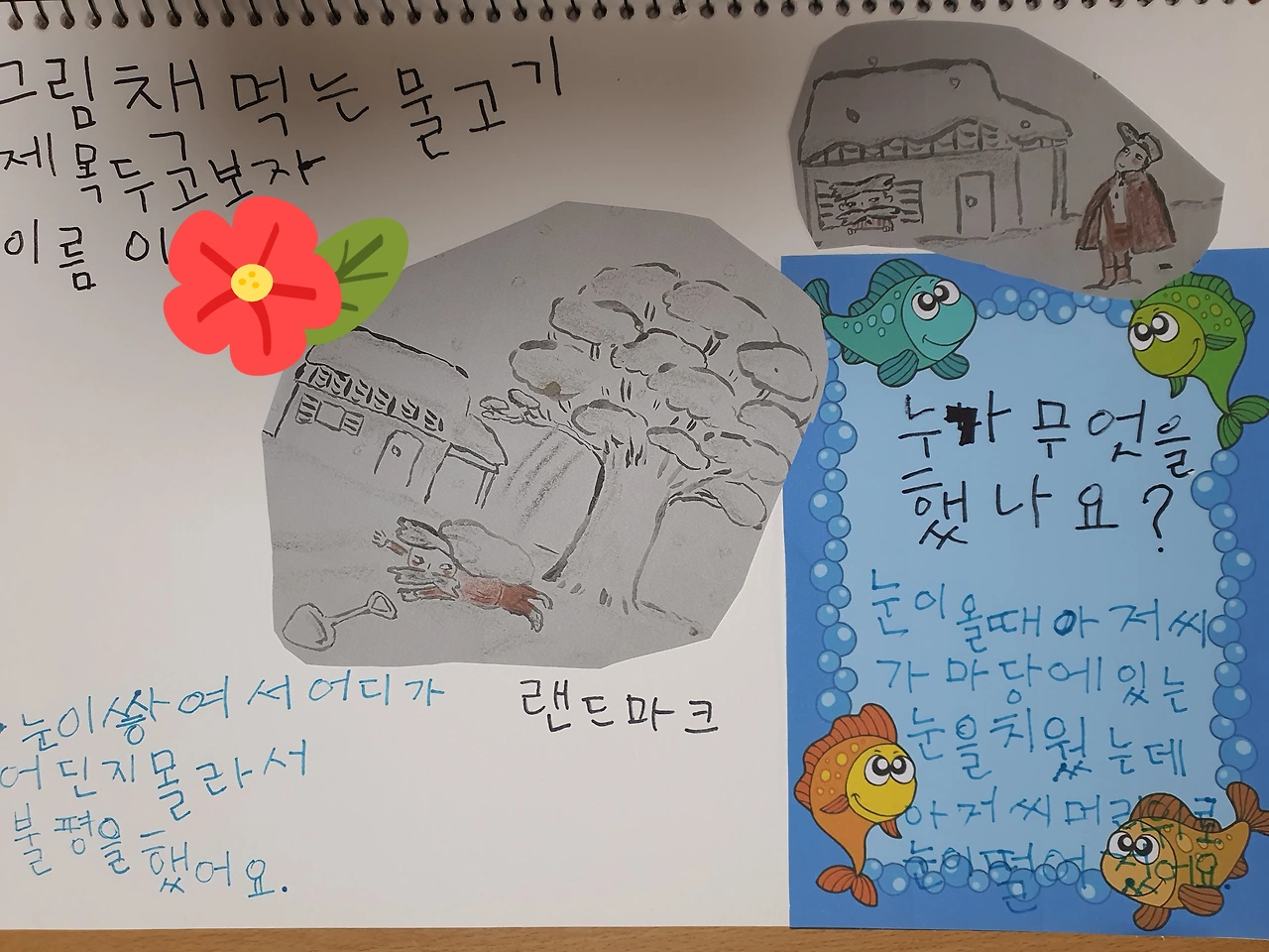 물고기 글 상자에 문장을 쓰고 이로 이로 인해 일어난 문제를 같이 쓴다. 그리고 그 부분을 그림책에서 찾아서 오려 붙이고 옆에 그림을 그려 넣으면서 수업을 마무리했다.