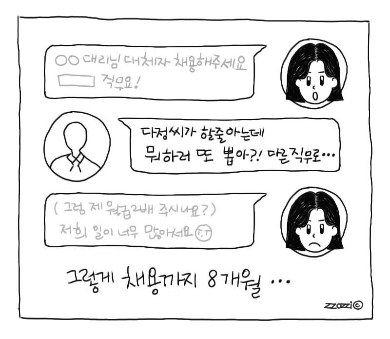 '대체자 뽑힐 때까지만, 다정씨가 이것도, 저것도, 그것도 할 수 있지?' 하고는 채용까지 8개월 걸려버리기...!