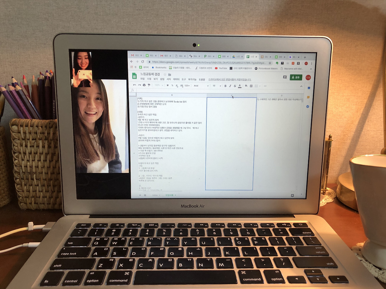 우리는 2주에 1번씩 화상 채팅으로 만나서 각자의 작업의 진행상황, 그 과정에서 느낀 것 공유하며 영감을 나눈다. 그러고 나서는 다음 2주에 대한 계획을 다잡으며 하고 싶다고 생각한 일을 계속해나갈 원동력을 얻는다. 최근에는 친구의 상황에 변화가 생겨서 평일에도 종종 만나고 있다. 둘 다 글 쓰는 걸 좋아하고 필요로 하기에, 시간을 정해두고 화상으로 만나 각자 쓰고 싶은 글을 쓰는 '겹겹 라이팅' 시간도 갖기로 했다. 또 공동 계좌를 파서 워크숍 비용(놀러 갈 속셈)을 모으고, 매년 말에 각자와 우리의 크고 작은 실패와 성취들 기념하는 파티를 갖기로 했다.