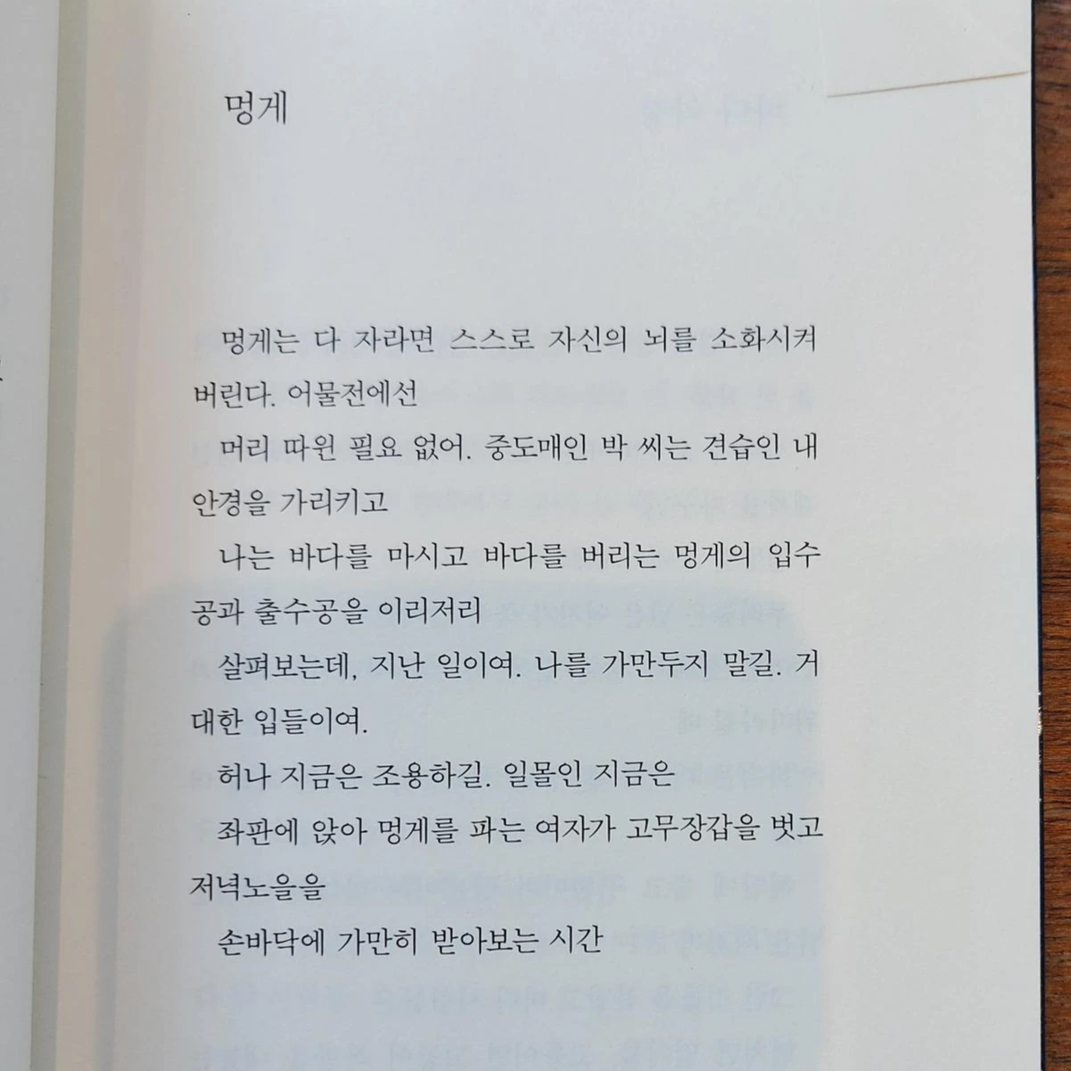 그날 여러 개의 시집을 추천받았지만 제일 마음에 남는 시집은 '멍게'였다. 속을 시원하게 뚫어주는 바다를 싫어하는 사람은 없겠지만, 내가 정을 느끼는 바다는 바다의 짠내와 철의 녹슨 냄새, 생선의 비린내가 섞인 항구가 있는 바다이다. 아버지가 어부도 아닌데 이런 기분을 느끼는 게 나도 의아하지만 어릴 때부터 맡은 고향의 내음 같다. 그래서인지 진한 남색의 슬픔이 울컥하고 바다의 짠내가 느껴지는 멍게에 담긴 시들이 나에게 와닿았다.