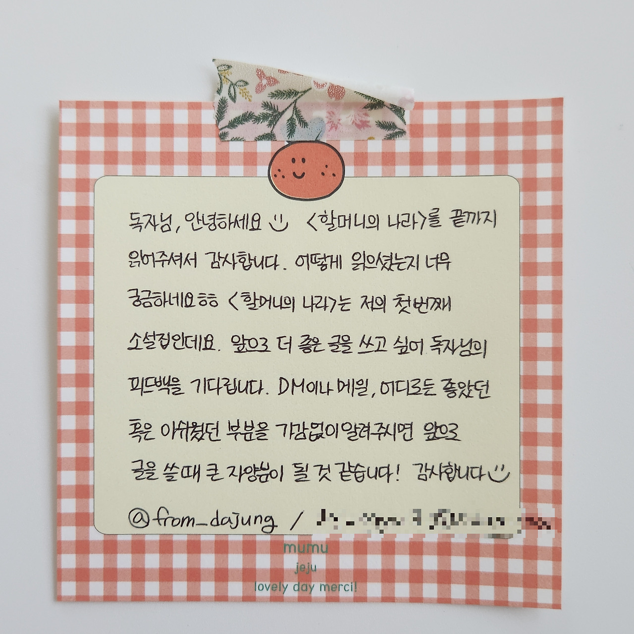 그 와중에 운 좋게도 책을 첫 공개하는 <제3회 마우스 북페어>에는 스태프로 참여하게 되었다. 오며 가며 독자를 만날 수 있는 적당한 거리가 생겼다. 마우스 북페어 1일 차, 책 판매에 대한 기대보다 스태프로 맡은 역할을 잘 해내야 한다는 책임감에 집중하다 보니 시간이 금방 흘렀다. 늦은 점심을 먹고 복귀하던 길, 스태프 단톡방에서 <할머니의 나라>가 품절이라는 소식을 들었다. 총 10권을 입고하였는데 벌써 다 팔렸다니, 내 책이 독자를 만났다는 사실에 감격스러웠다. 주변의 축하에도 쉬이 즐기진 못했다. 마음 한 구석에는 첫날이고 첫 공개다 보니 가족들과 지인들이 많이 왔다 가서 그런 거라 여겼다.
