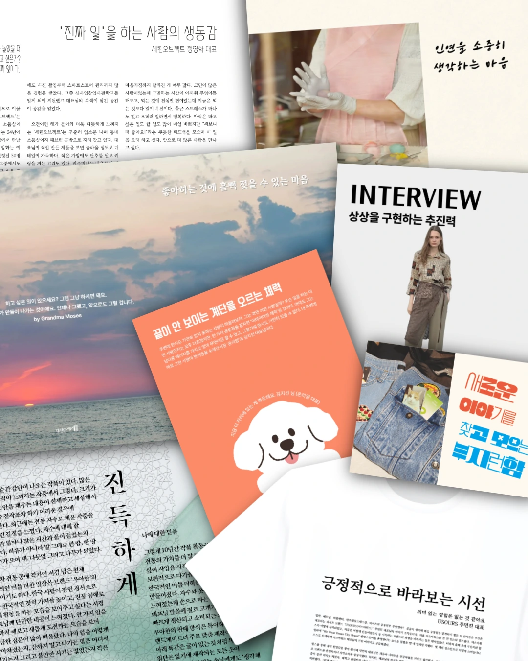 인터뷰이가 떠오르는 형태로 만들려 애썼다. 전통 공예를 현대적으로 풀어내시는 대표님 인터뷰는 전시 포스터처럼 만들고 싶어 커다란 포스터 종이에 인쇄하였고, 미술 공방을 운영하며 종종 작품 전시도 하는 대표님 인터뷰는 전시장에서 볼 수 있는 리플렛처럼 인쇄했다. 빈티지 의류 스튜디오를 기반으로 다양한 활동을 하는 대표님 인터뷰는 25 시즌 룩북을 모은 잡지처럼 만들었고, 티셔츠 브랜드를 운영하는 대표님 인터뷰는 반팔 티셔츠에 인쇄했다. 반려동물 수제간식을 만드는 대표님 인터뷰는 종이가방에 클립으로 고정해 나가는 엽서를 상상하며 만들었고, 화과자 가게 대표님 인터뷰는 기사나 잡지처럼 느껴지게 세로 리플렛으로 만들었다.
