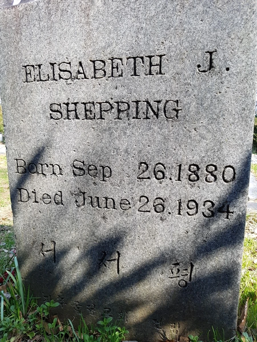 선교사의 묘는 우리나라에서 흔하게 볼 수 있는 반원형으로 봉긋하게 솟아 있는 모양이 아니다. 묘비만 덩그러니 놓인 경우도 있고, 긴 직사각형 틀 안에 자갈이 깔려 있는 묘와 묘비가 함께 있기도 하다. 탑 모양으로 된 것도 있다. 선교사 묘역 중 다섯 번째가 서서평의 묘이다. 서서평의 묘비를 쉽게 찾을 수는 없었다. 묘역 안내도가 있는 곳으로 들어서지 않은 까닭에 묘비 하나하나를 일일이 읽어 보아야 했는데, 길에서 보이는 묘비엔 아무런 글자도 새겨져 있지 않기 때문이다. 앞면에는 아무 것도 기록되지 않았으나 뒷면에는 Elizabeth J. Shepping, Born Sep 26. 1880, Died June 26. 1934, 서서평, 광주금정교회 건립이라 새겨져 있었다.