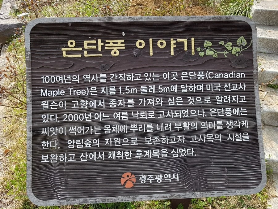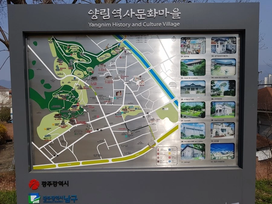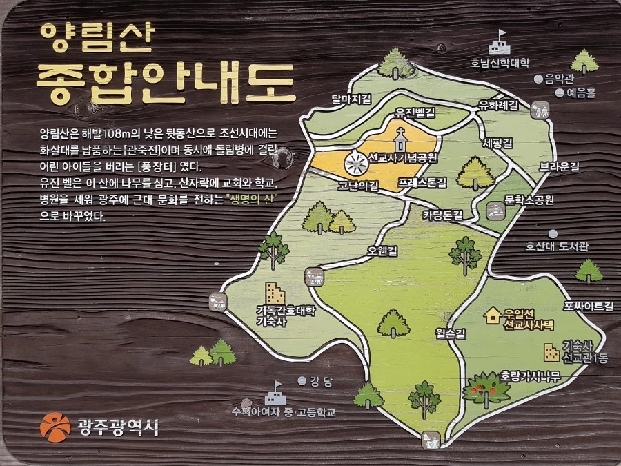 광주 양림동, 해발 108m 양림산 주변은 100년 전 외국에서 온 선교사들의 터전이었다. 선교사들의 흔적이 잘 보존 되어있어서 근대문화유산을 찾아볼 수 있는 유적지가 많이 있다.