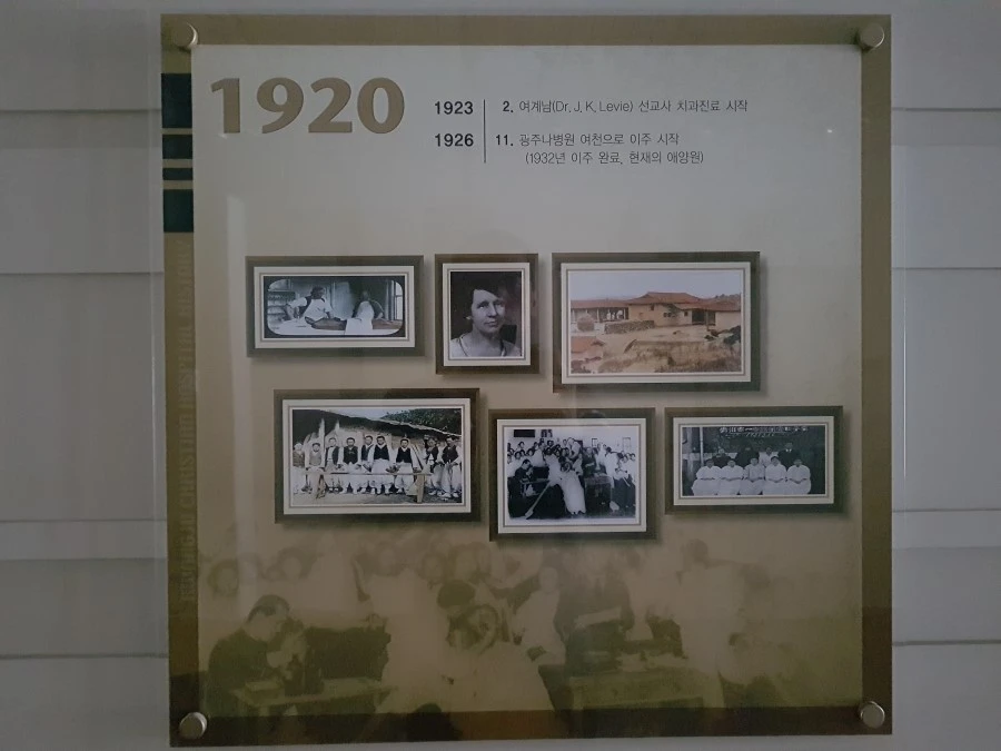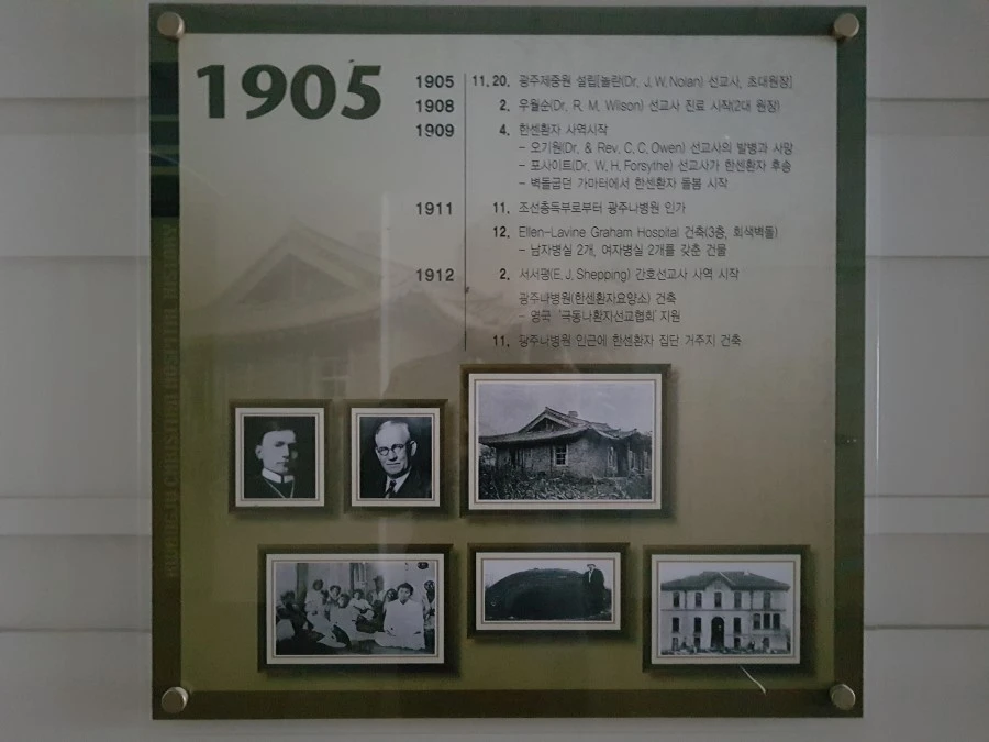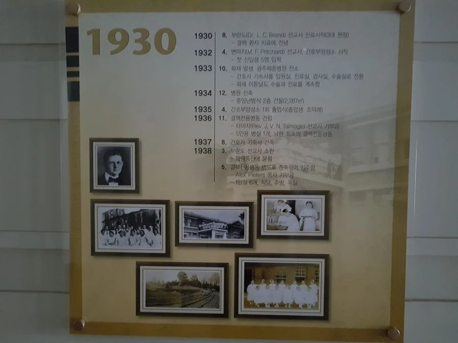 <기독병원 1층 로비에는 역사관이 있다. 역사관 내부에 년도별로 전시된 사진들>