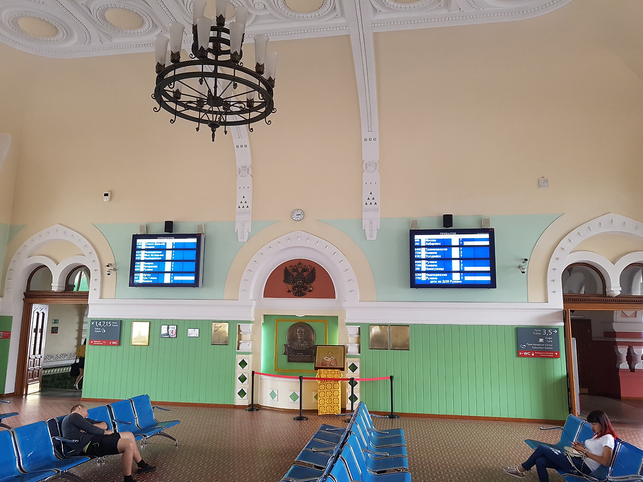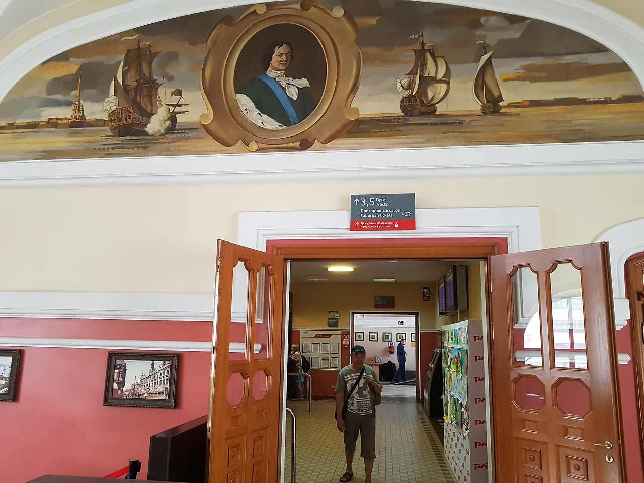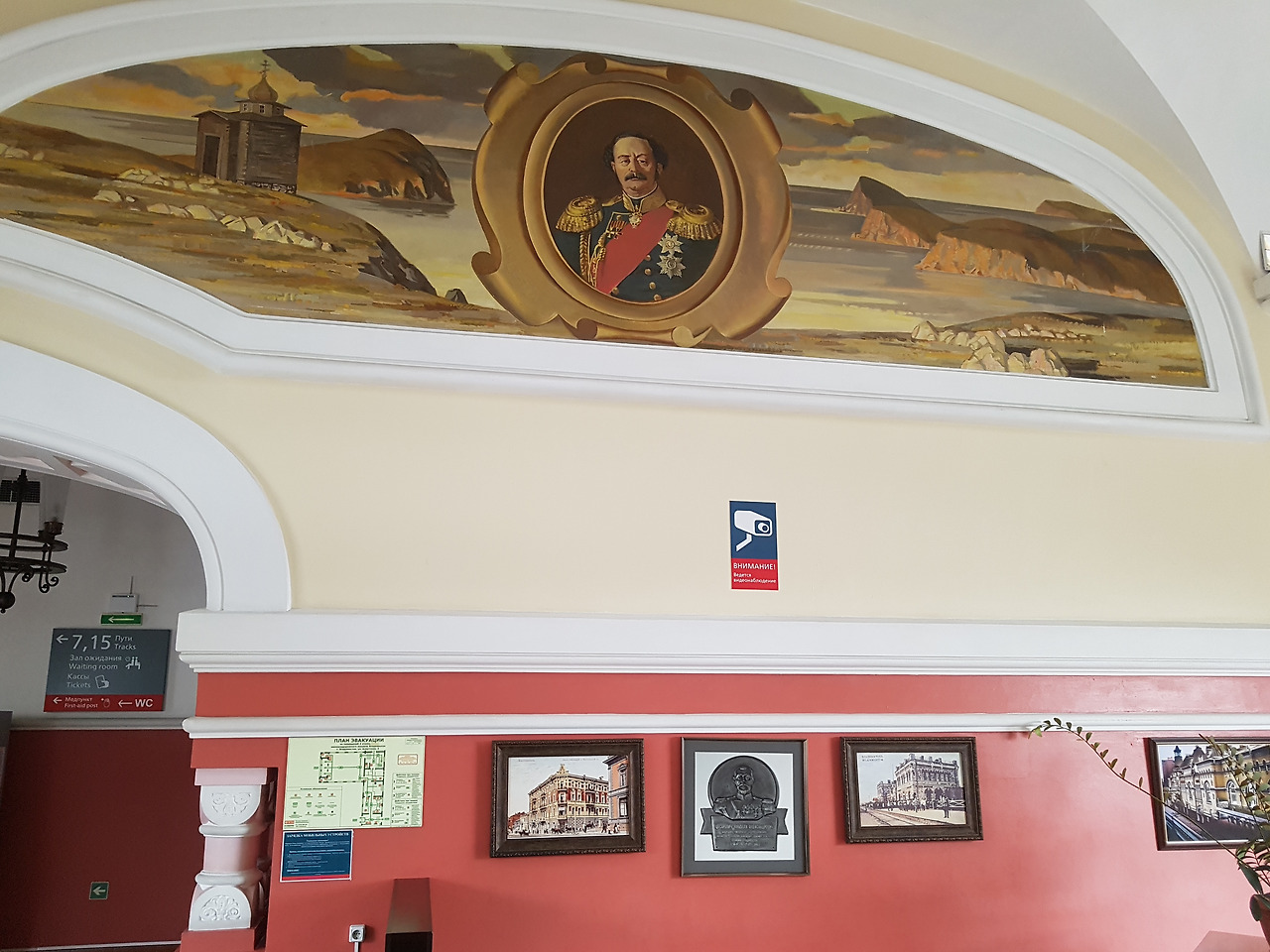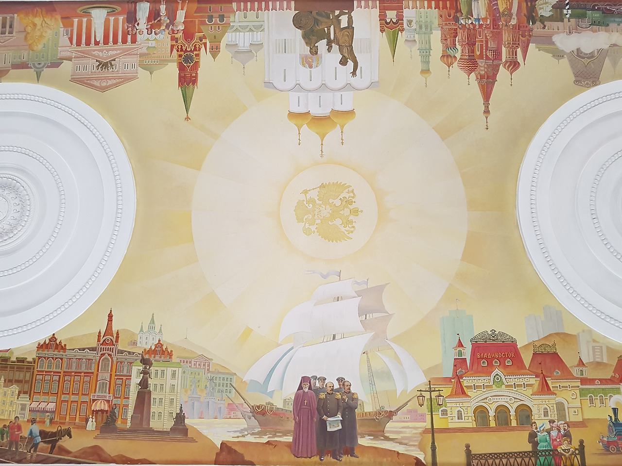 율 브린너 생가에서 5분 거리에 있는 불라디보스톡 역으로 갔다. 어제 공항에서 버스를 타고 내린 곳이 블라디보스톡 역 건너편이어서 쉽게 찾을 수 있었다. 고풍스러운 모습의 블라디보스톡 역이 눈길을 사로잡는다. 1600년대의 건물 양식이다. 역의 외관은 내가 좋아하는 상아색이다. 그래서 더 마음에 든다. 역 안으로 들어서려니 검색대가 가로막는다. 이젠 익숙하다. 가방과 호주머니에 있는 열쇠, 손에 든 스마트 폰을 검색기에 밀어 넣고, 나는 금속을 탐지하는 검색대를 통과해서 내 가방과 물건들을 챙겼다. 대합실이 그리 크지는 않다. 1600년대에 사람 수도 적었을 거고, 여행객은 그보다 더 적었을 테니 클 필요가 없었을 것이다. 1900년대에 지어진 서울역도 지금처럼 크지 않았다. 천장을 올려다보니 그림이 그려져 있다. 서양을 여행할 때는 꼭 천장을 봐야 한다. 천장에 그림이나 장식이 되어 있지 않은 우리나라 사람들이 놓치기 쉬운 것이 천장 그림이다. 천장 그림은 모스크바와 블라디보스톡의 상징물을 그렸다.