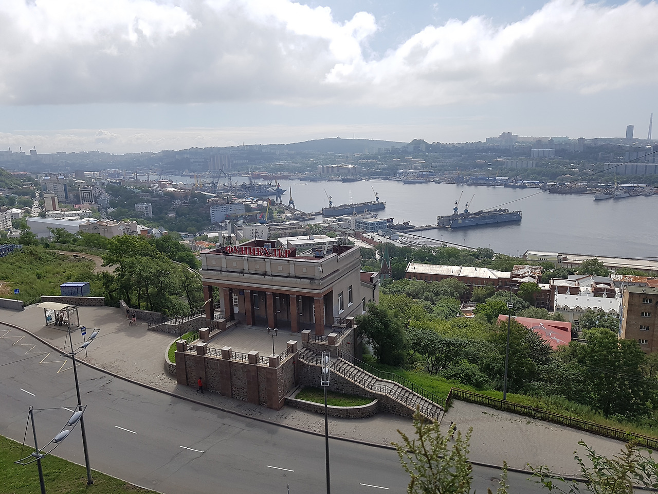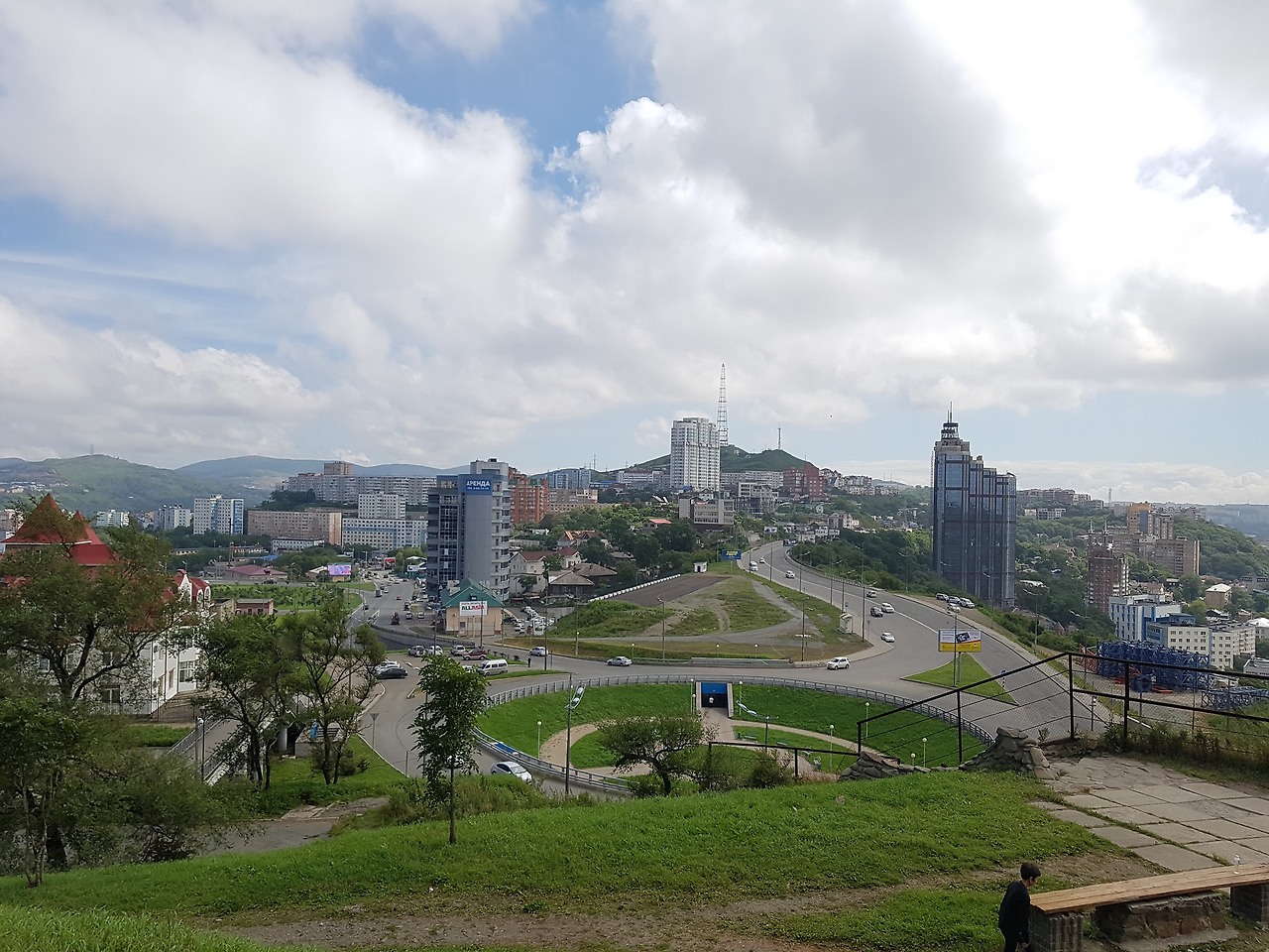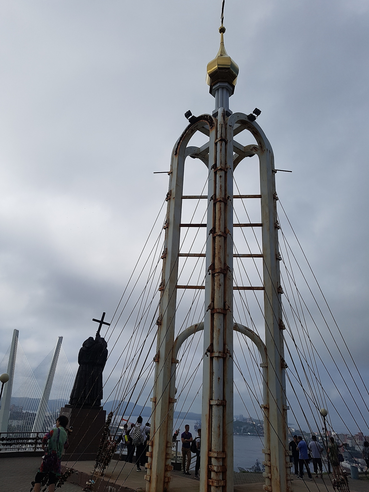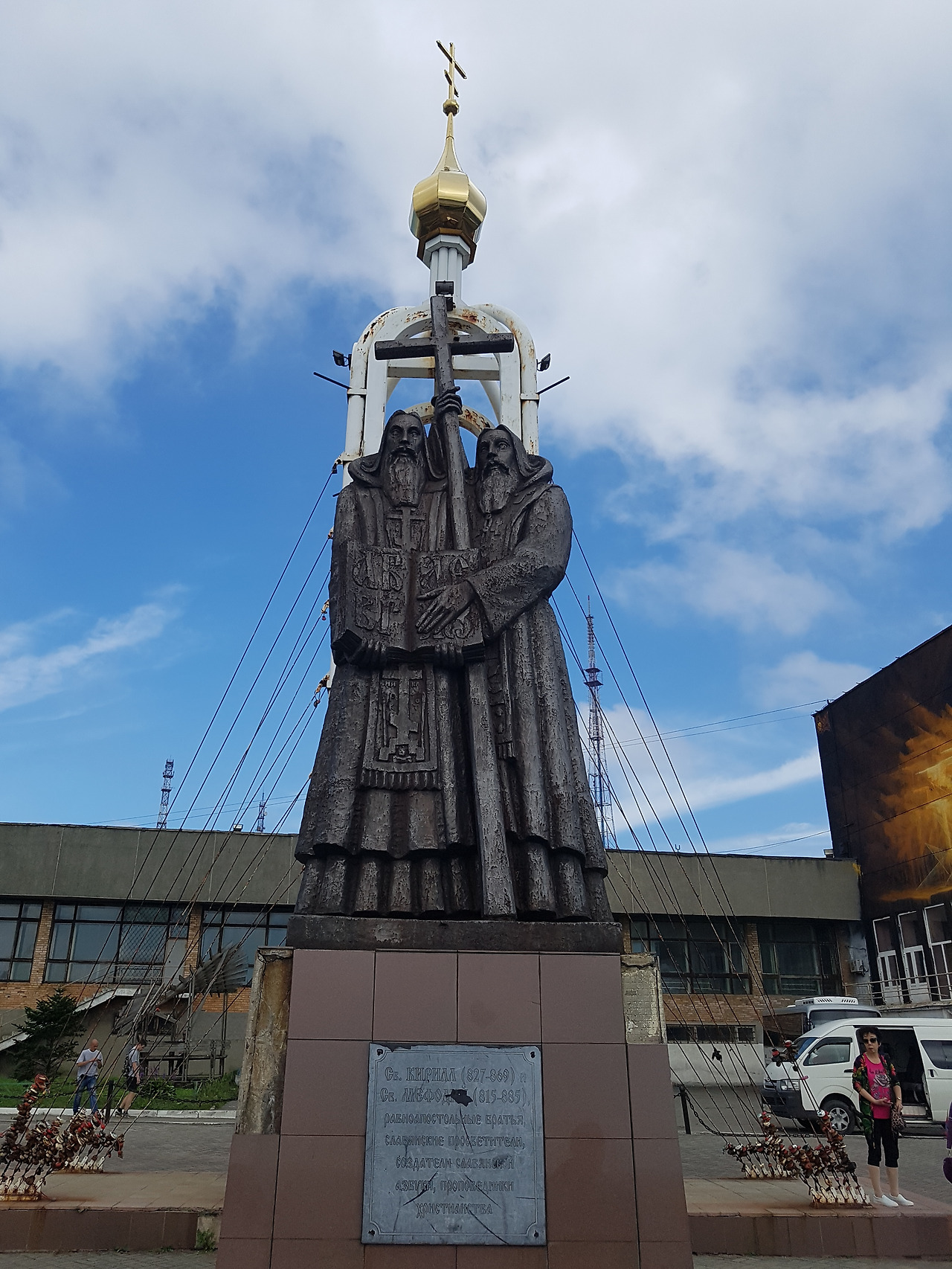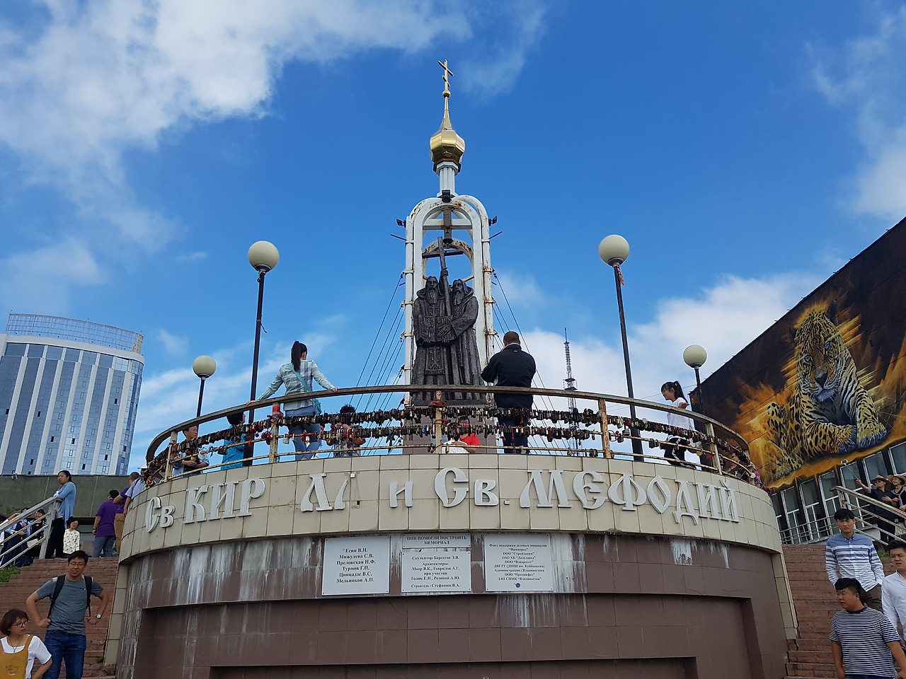 길을 재촉해 오르니 구글맵 지도에 나온 길은 전망대를 돌아가는 것으로 나온다. 시간을 단축하기 위해 아파트 길로 들어섰다. 지도가 가르치는 방향으로 최대한 직선거리로 갔다. 전화도, 인터넷 SNS로도 연락이 되지 않으니 내가 약속 장소에 늦으면 사람들이 걱정하고 기다릴 거고, 일행을 이끌고 있는 내 사랑하는 아들이 제일 애가 탈 것이기 때문이다. 급한 경사길의 계단을 뛰고 생전 처음 와본 길을 망설임 없이 해치고 나갔다. 땀은 났지만 다행히 아파트 사이로 지도에는 없는 길이 뚫려 있어서 약속시간보다 15분 먼저 도착할 수 있었다. 전망대에 오르니 블라디보스톡 항구와 금각교, 혁명 광장이 내려다 보였다. 군사 항이라고 하더니 군함도 여러 척 있었다. 시간이 되어도 일행이 나타나지 않으니, 혹시 내가 전망대가 아닌 다른 곳을 전망대라 착각하고 있는 것은 아닐까? 염려되었다. 푸니쿨라를 탈 거라는 말을 들었기에 푸니쿨라 하차장을 찾았다. 사람들이 몰려서 올라오는 끝을 눈으로 추적했더니 푸니쿨라 종점이 보였다. 푸니쿨라에서 내린 사람들이 길 위로 나서서 지하계단을 거쳐 광장을 지나고 육교를 건너 전망대로 오르는 모습을 확인했다. 멀리서도 눈에 띄는 주황색 옷을 입은 사람이 전망대까지 오는 것을 보고 여기가 전망대라 확신이 됐다. 키릴 문자를 만든 형제의 동상 앞에 서서 기다리다 계단에 앉아서 사람들을 구경했다. 역시 가장 많은 사람들은 중국인, 그리고 일본과 우리나라 사람들이다. 여행객들이 나누는 이야기를 들으면 내가 못 가본 여행지에 대한 정보를 들을 수 있다. 처음 푸니쿨라 하차장을 찾을 때 우리나라 사람 같은 아가씨가 보이길래 '푸니쿨라 타고 오셨어요? 하고 물으니 "아니요, 저는 중국사람입니다."라고 우리나라 말로 대답한다. 오늘 말을 걸어 물어본 여자가 모두 일본과 중국 사람이다. 내가 여자 보는 눈이 어둡다. 그래도 물으면 상냥하게 대답해줄 것 같은 우리나라 사람으로 보이는 아가씨에게 묻는데 오늘 100% 실패다. 외국 나가서 내 행동이 눈살을 찌푸리게 한 것 같으면, '쓰미마셍' 하라 했다. 서양인의 눈으로 보면 일본인과 우리나라 사람, 중국인은 구분이 안 되긴 할 것이다.