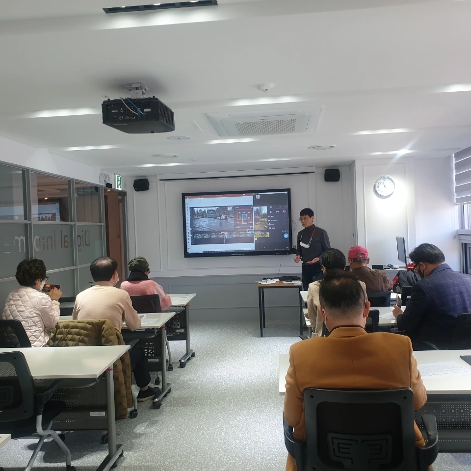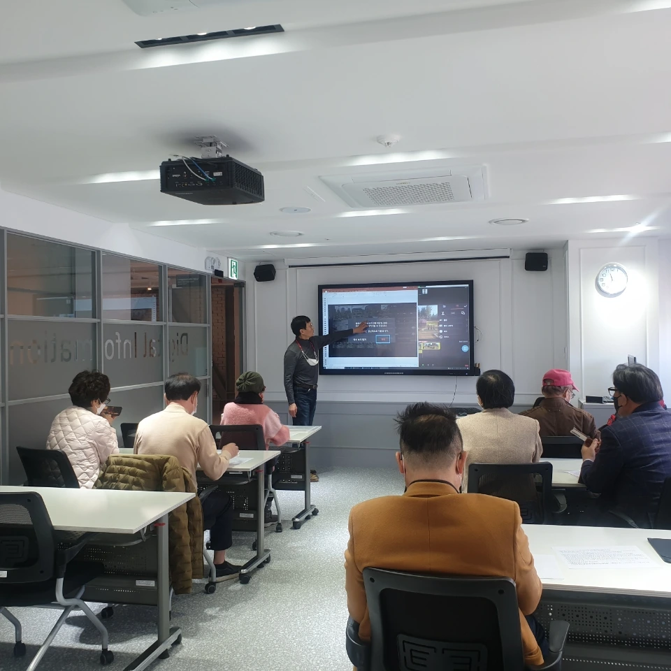 내가 직접 스마트폰으로 영상 편집하는 과정을 보여주기 위해서는 작은 스마트 폰 화면을 크게 볼 수 있도록 할 필요가 있었다. 이 문제는 도서관 컴퓨터에 내 스마트폰을 동기화시킬 수 없어서 Zoom프로그램을 활용해 내 스마트폰 화면을 대형 전자칠판에 띄어 보여 주었다. 파워포인트와 시연을 통한 두 번의 설명을 마치고 수강생들의 실습시간, 강의장을 돌아다니며 실습에 어려움을 겪는 시민들을 도왔다. 보조강사 없이 열다섯 명의 수강생들을 가르치다 보니 두 시간이 금방 지나갔다.
