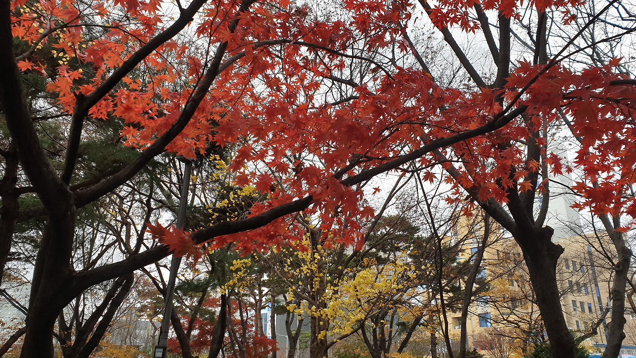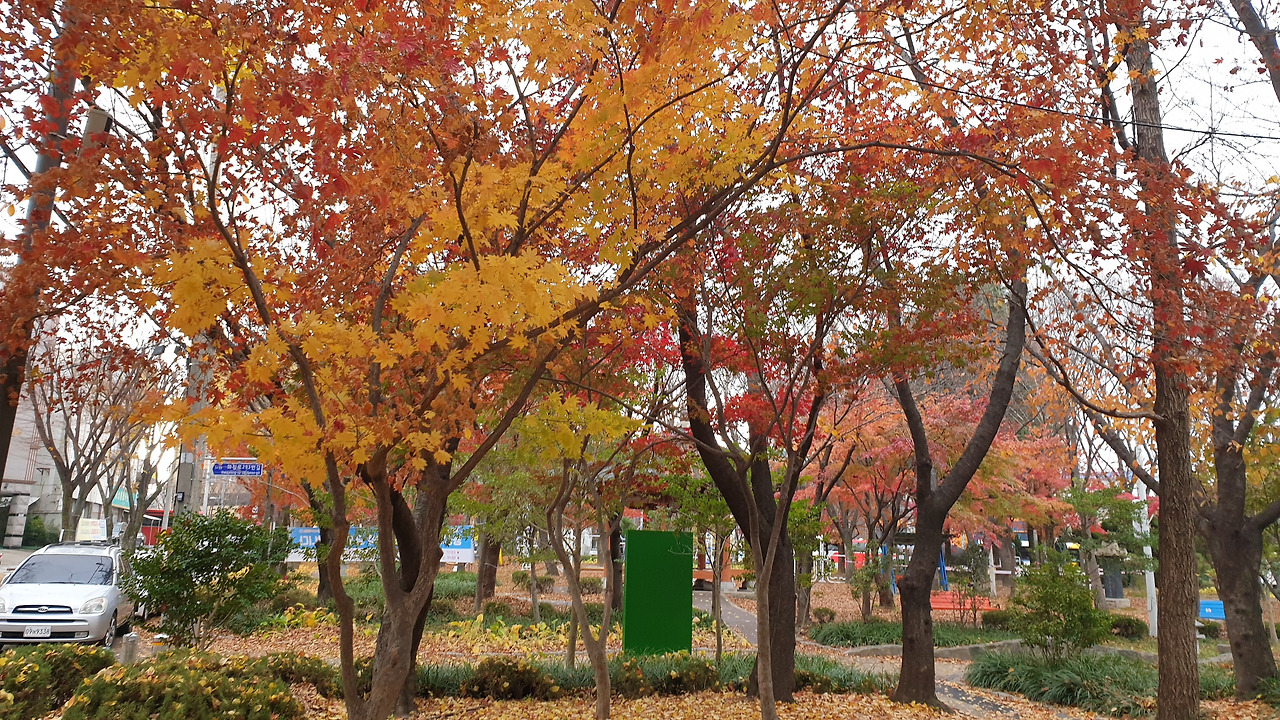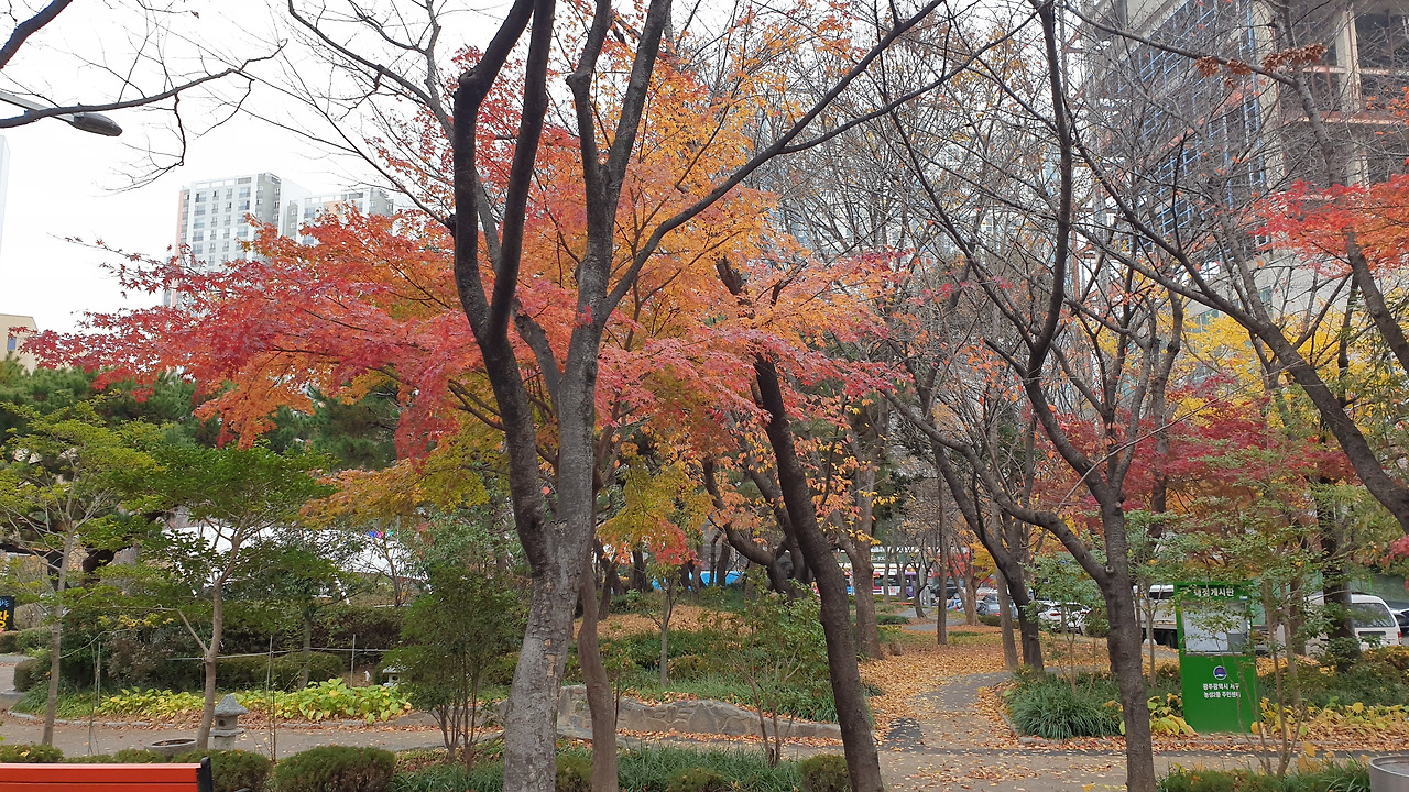 쉬지 않는 시간에 이끌려 세월은 어느덧 가을 끝자락에 이르렀다. 하지만 농성광장 공원 나무들은 여전히 가을을 머금고 있다. 앞만 보고 바쁘게 살아가는 사람들이 넘쳐 나는 도시에서, 넉넉한 공간에 많은 풀과 나무들이 숨 쉰다. 계절 앞에서 나무는 늦장을 부린다. 더러는 나뭇잎 다 떨구고 검은 회색 빈 가지를 드러내 놓은 나무도 있지만, 제법 많은 나무들이 지난겨울부터 숨겨온 영혼의 빛을 마침내 가을에 드러낸 색동옷 차림이다. 심지어 어떤 나무는 아직 푸르기까지 하다.