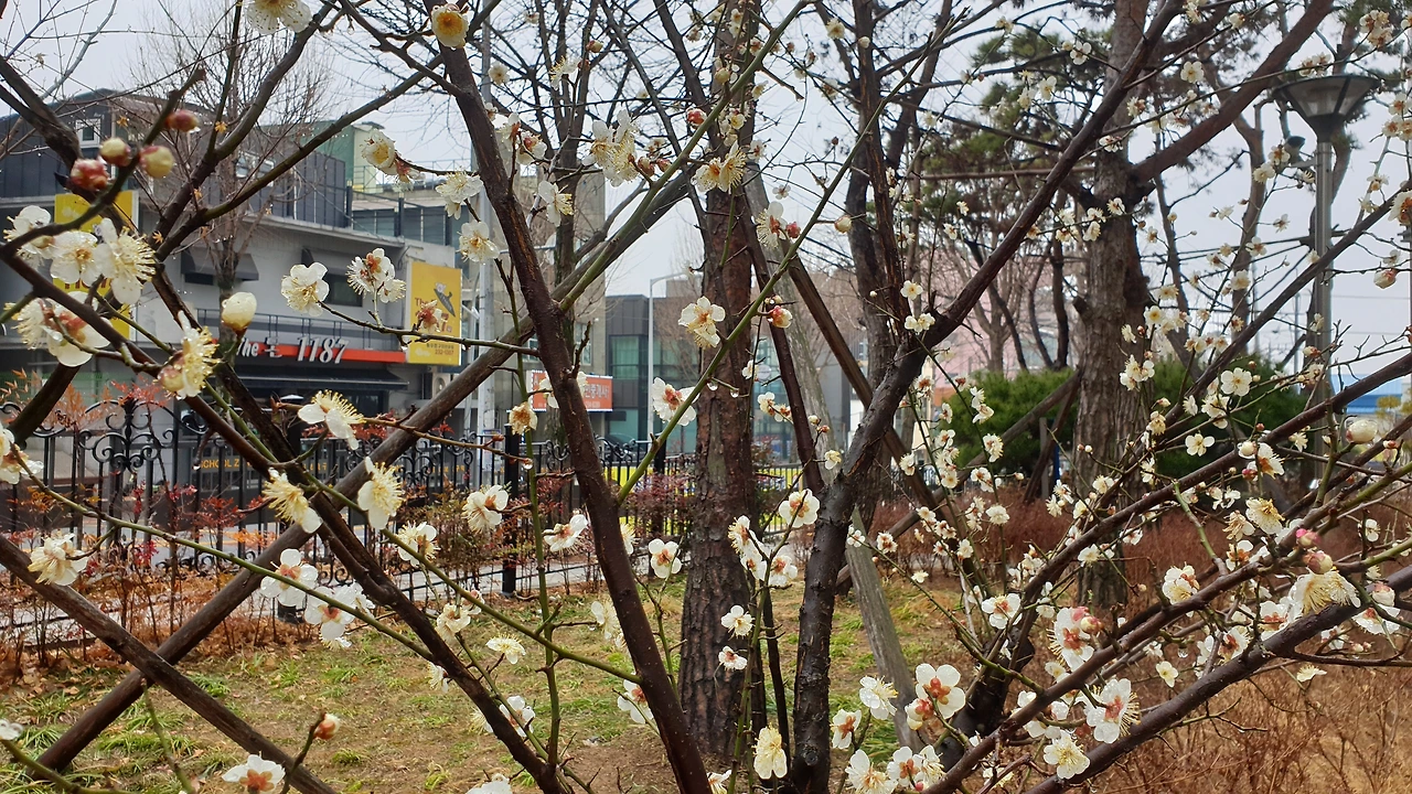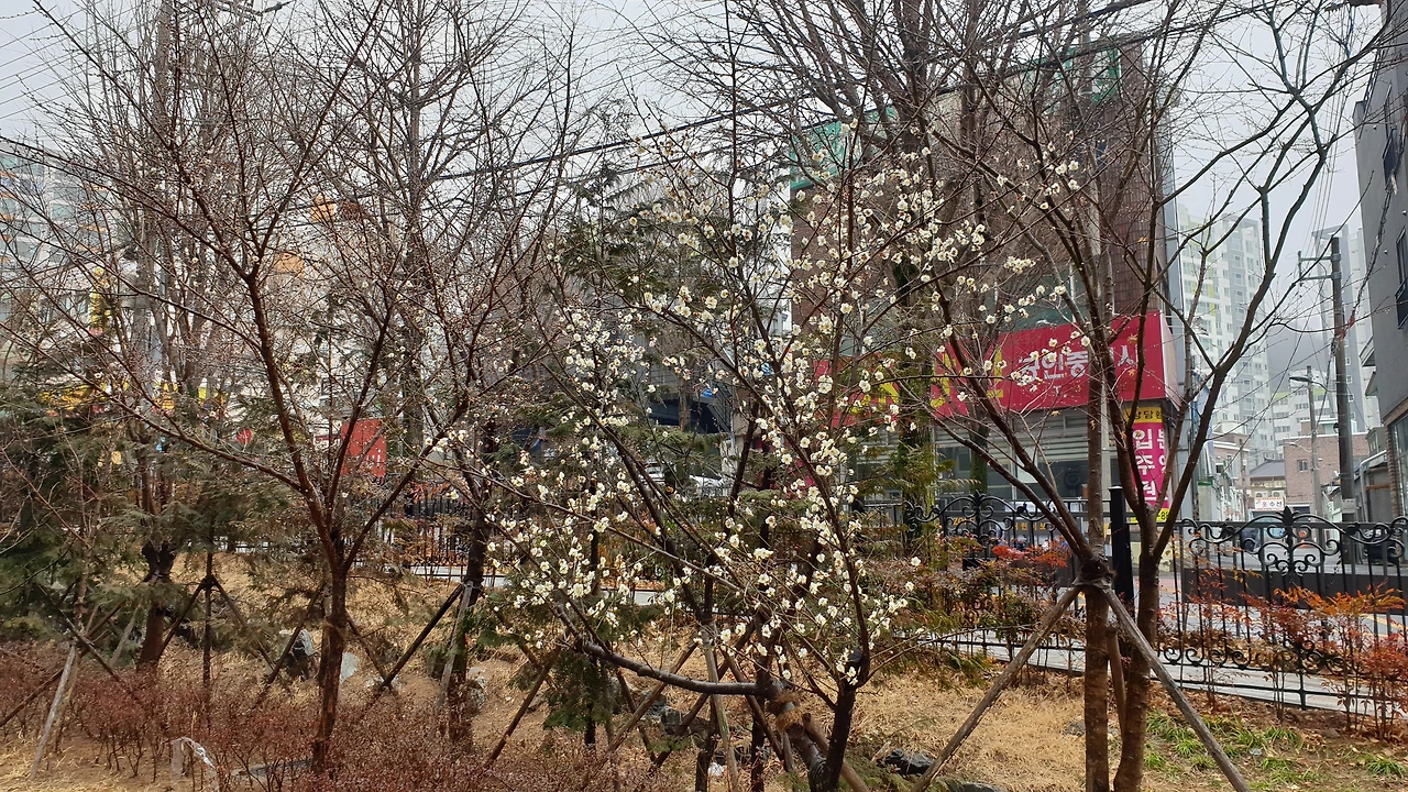 집 아파트 화단 나뭇가지에 눈송이처럼 하얀 매화가 달렸다.매화 꽃잎에 봄비가 눈물처럼 맺혔다.