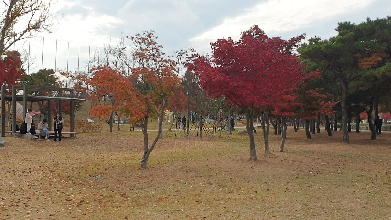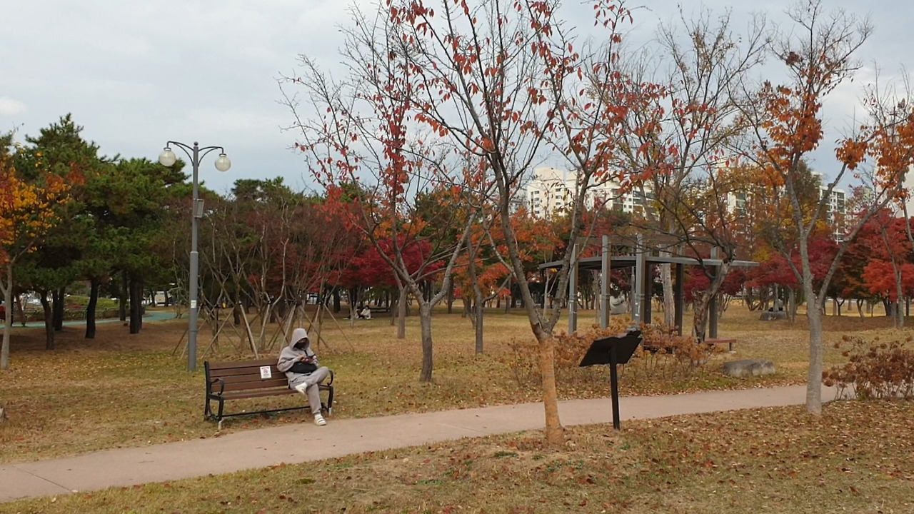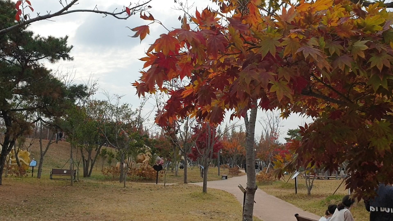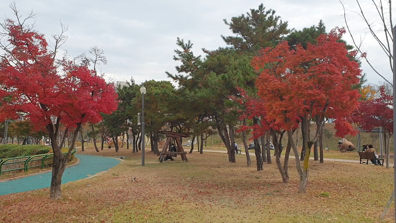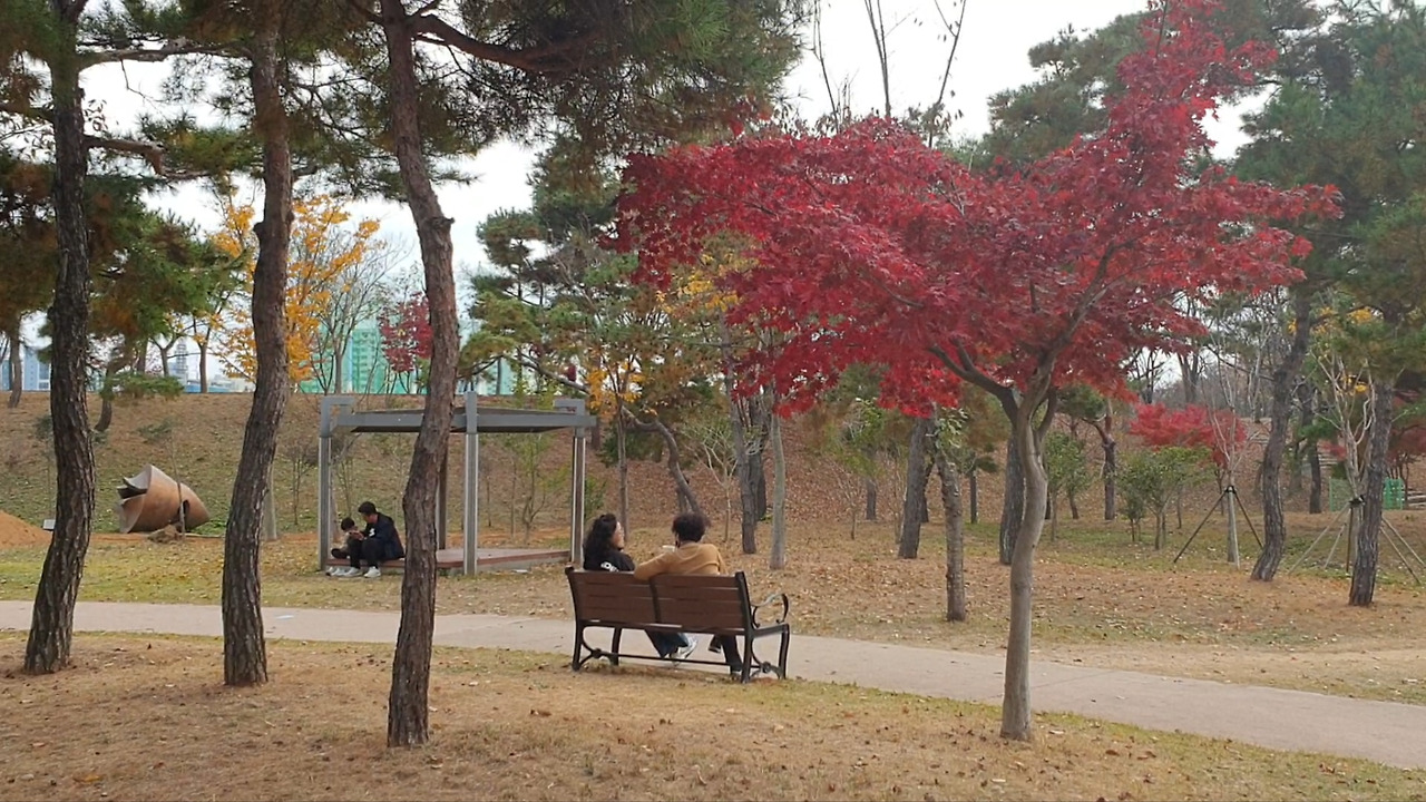 상무시민공원에 왔다. 근처 결혼식장에서 축하하고 식사를 마친 후였다. 지하 식당에서 수십 가지 음식을 접시에 옮겨 담아와 소처럼 우걱우걱 먹었다. 소가 아니라 되새김질을 할 수는 없으니, 옆에 있는 공원을 찾았다. 일이 바빠서 단풍을 제대로 보지 못하기도 했고, 소화도 시켜야 했기 때문이다. 근처 아파트 단지에 둘러싸인 공원은 주민에게 오아시스 같은 곳이다. 다행히 공원의 나무는 단풍이 절정에 든듯했다.