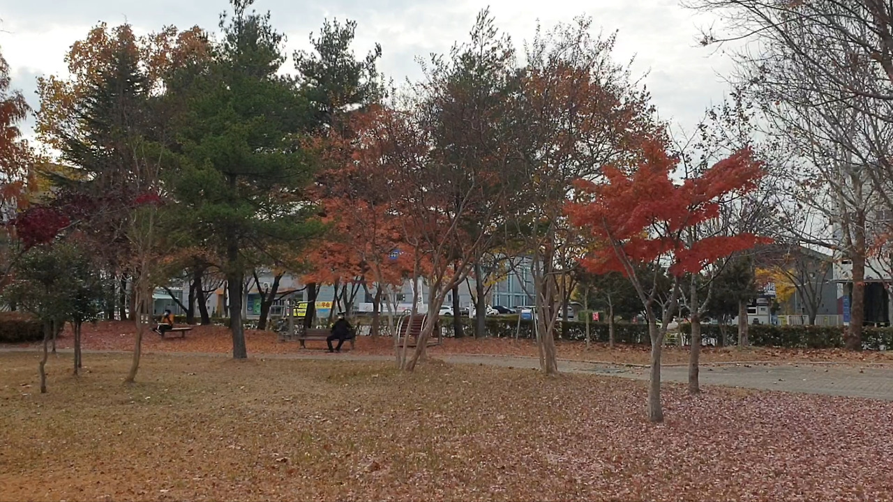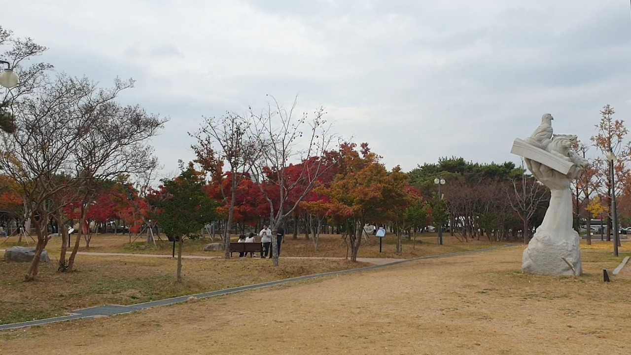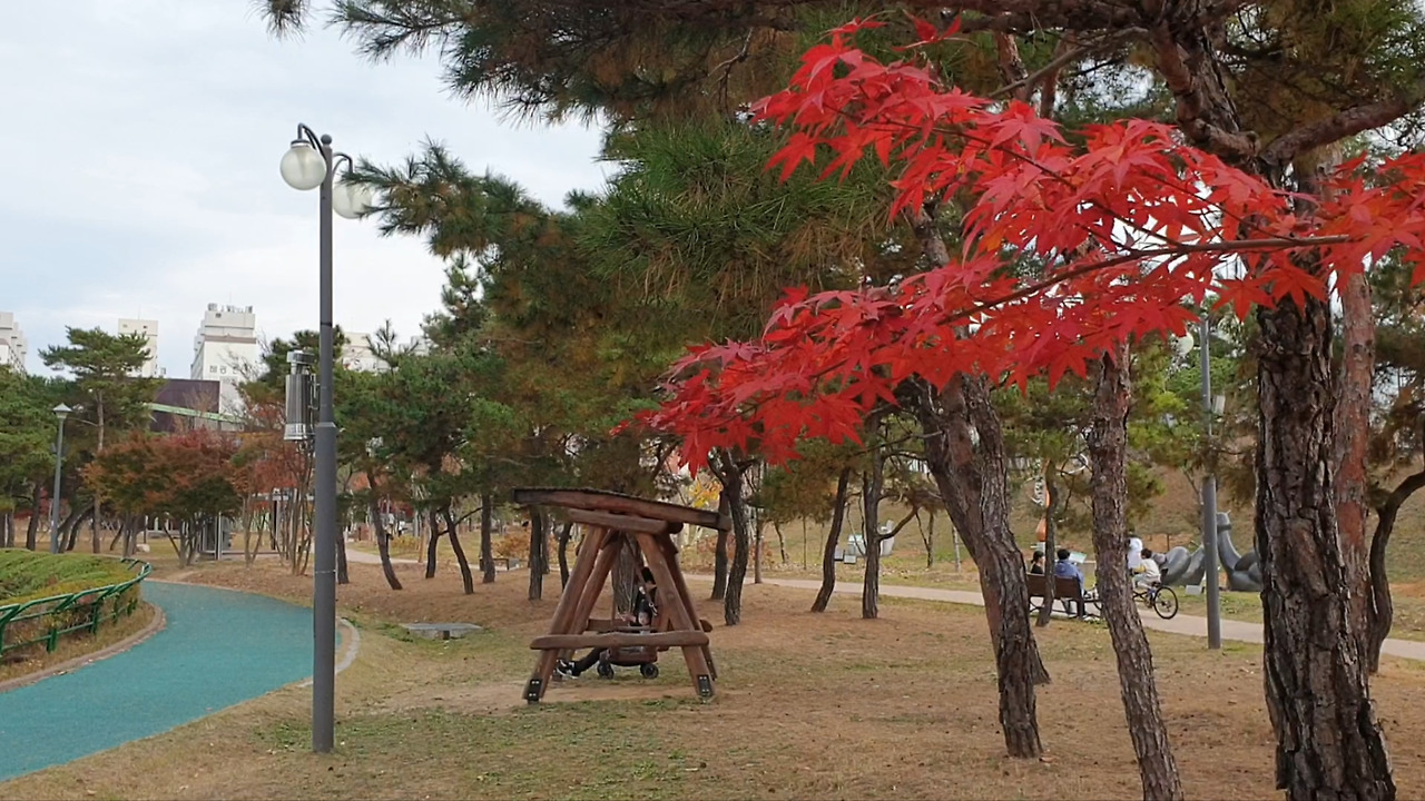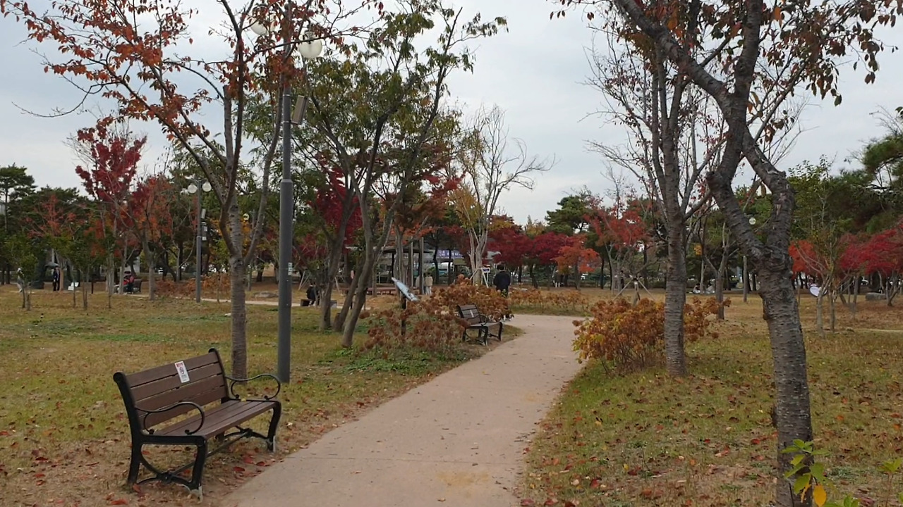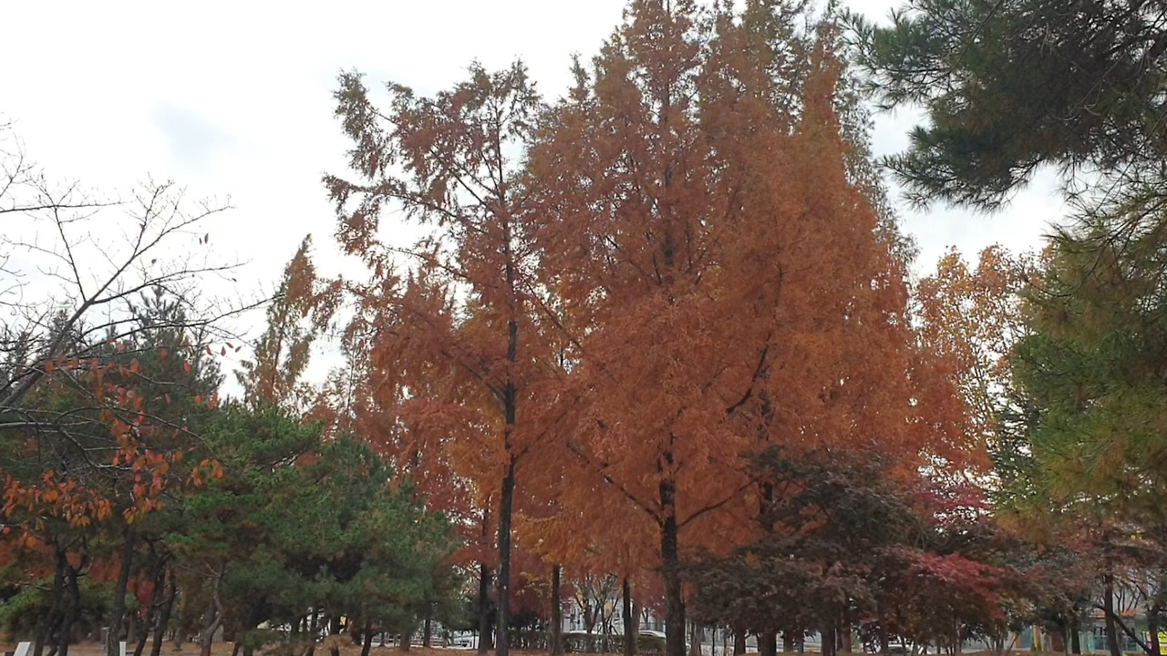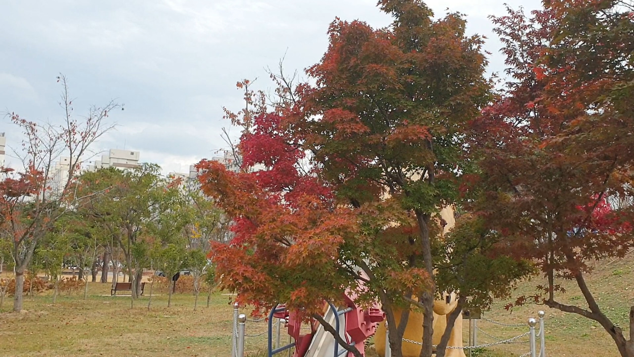 상무시민공원에 왔다. 근처 결혼식장에서 축하하고 식사를 마친 후였다. 지하 식당에서 수십 가지 음식을 접시에 옮겨 담아와 소처럼 우걱우걱 먹었다. 소가 아니라 되새김질을 할 수는 없으니, 옆에 있는 공원을 찾았다. 일이 바빠서 단풍을 제대로 보지 못하기도 했고, 소화도 시켜야 했기 때문이다. 근처 아파트 단지에 둘러싸인 공원은 주민에게 오아시스 같은 곳이다. 다행히 공원의 나무는 단풍이 절정에 든듯했다.