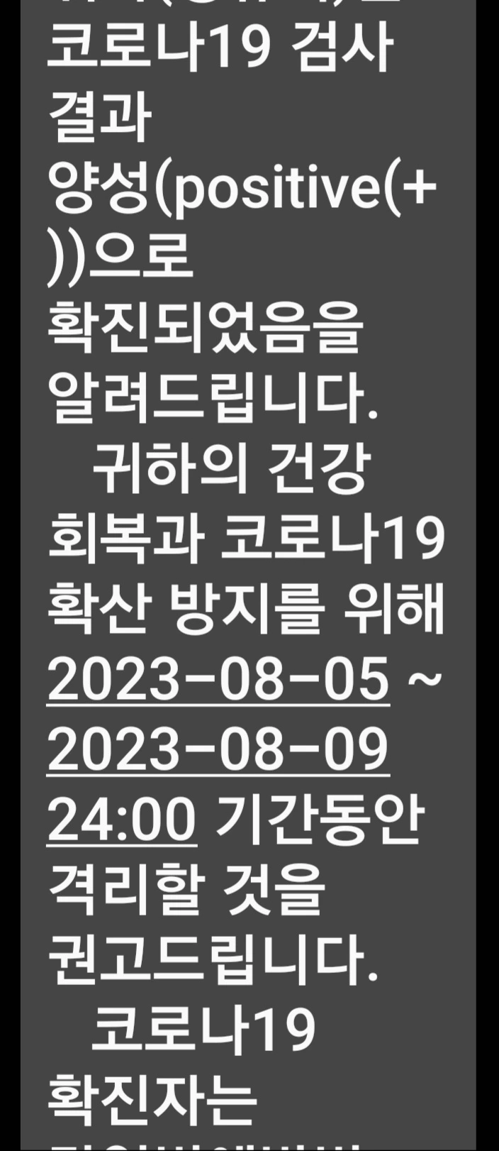 이렇게 끝나나 싶던 코로나가 다시 유행한다는 소식이 들리더니, 드디어, 마침내, 결국에는 코로나19에 걸리고 말았다. 어디서, 왜?, 누구로부터 감염됐는지는 모른다. 8월 3일 목요일 오후부터 머리가 아프며 추웠다. 이마를 만져보니 평소와 다른 열이 있음을 느꼈다. 추워서 사무실에 있는 점퍼를 하나 더 입고 일을 했다. 저녁 식사 후 잠을 자려는데 근육이 아팠다. 몸에 ‘리’ 자가 들어간 모든 곳이 아팠다. 머리, 허리, 다리에 더해 팔까지 아프니 쉽게 잠들 수 없었다. 몸살감기인가?