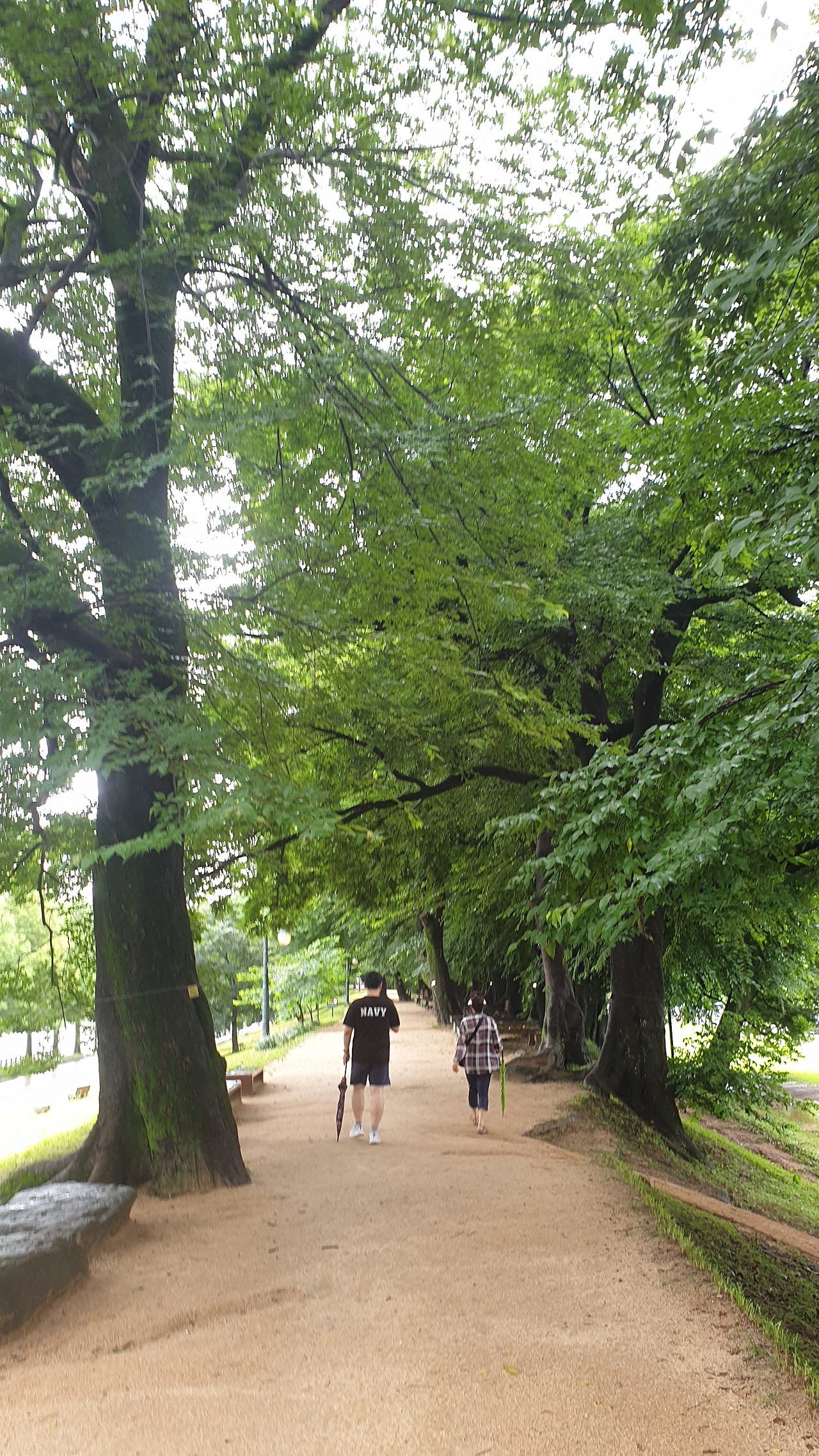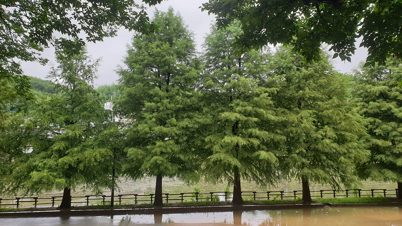 비가 오니 구름에 가려 햇빛이 없는데도 나뭇잎은 초록으로 빛났다.