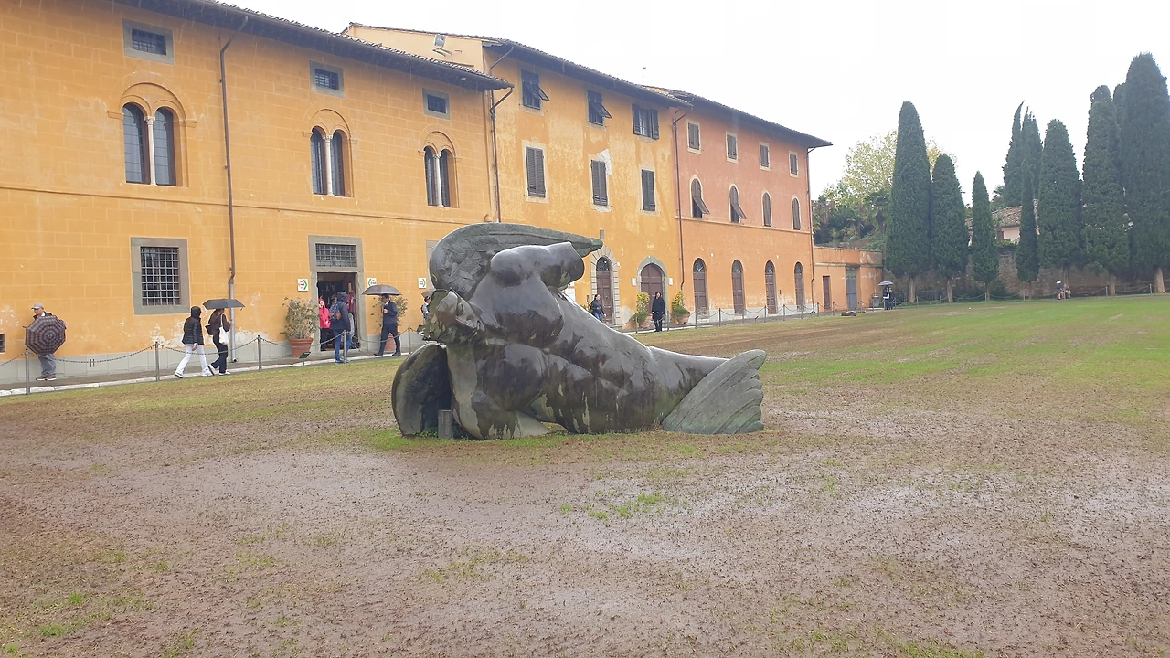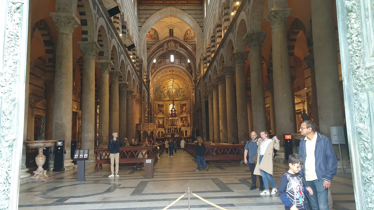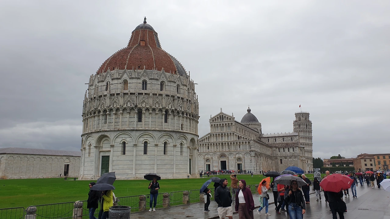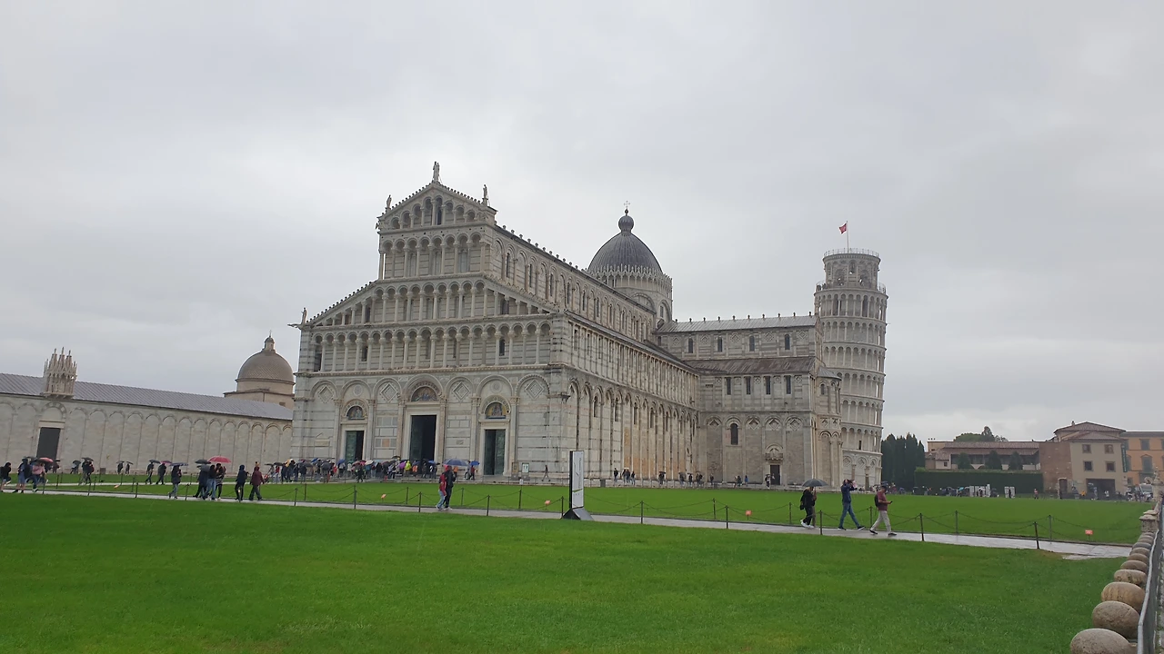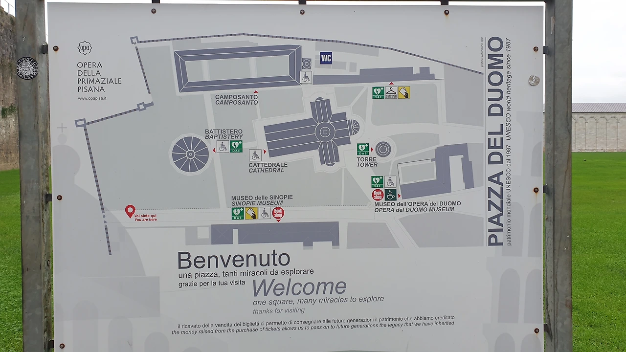 성벽 문을 지나자 둥근 돔으로 이루어진 건물과 십자가 모양의 성당, 그리고 기울어진 피사의 사탑이 보인다. 피사의 사탑은 십자가 모양 성당의 종탑으로 지어졌다. 물이었다 메워진 곳에 지어졌기 때문에 사탑 아래의 기초가 무게를 견디지 못하고 탑이 기울어졌다. 지금은 기초를 보강해 더 이상 기울어지지는 않는다. 피사의 사탑을 사진으로 촬영하는 위치에 따라 탑이 기울거나, 아니면 똑바로 선 모습으로 보이기도 한다.