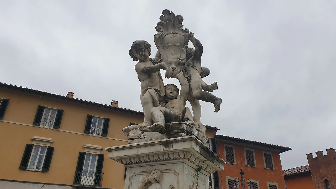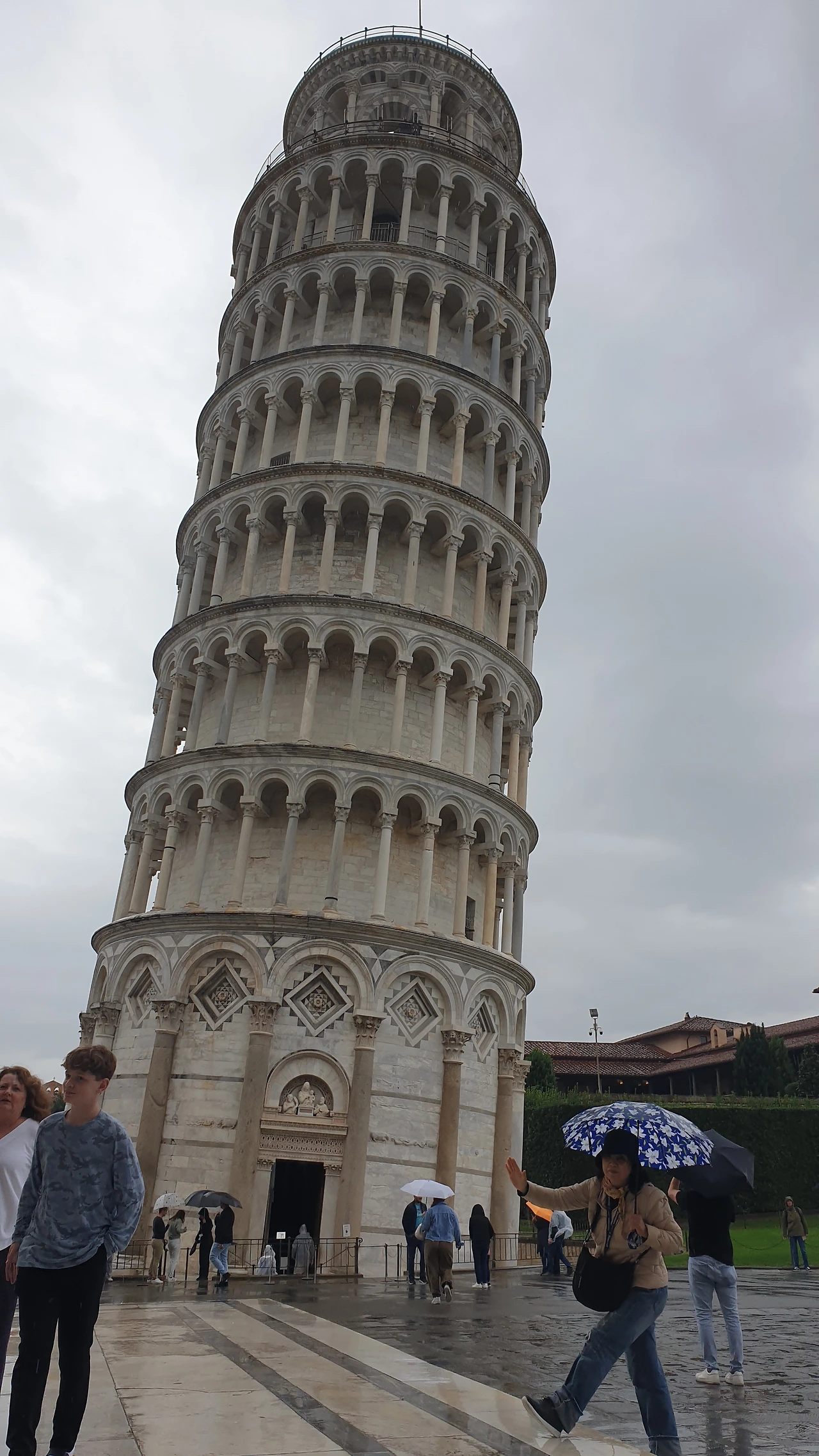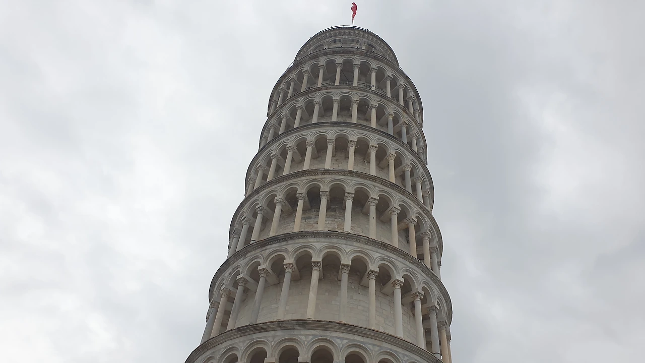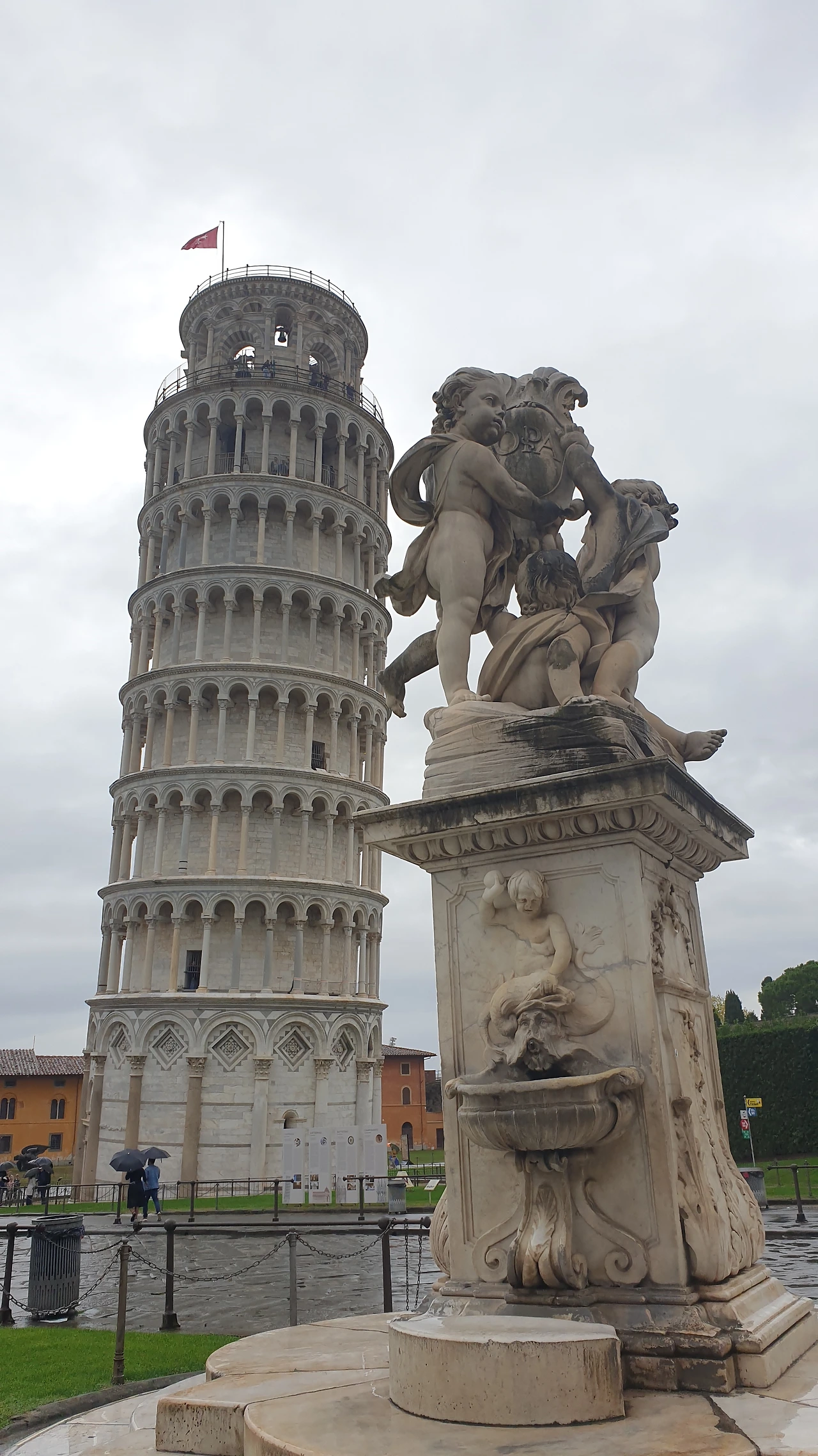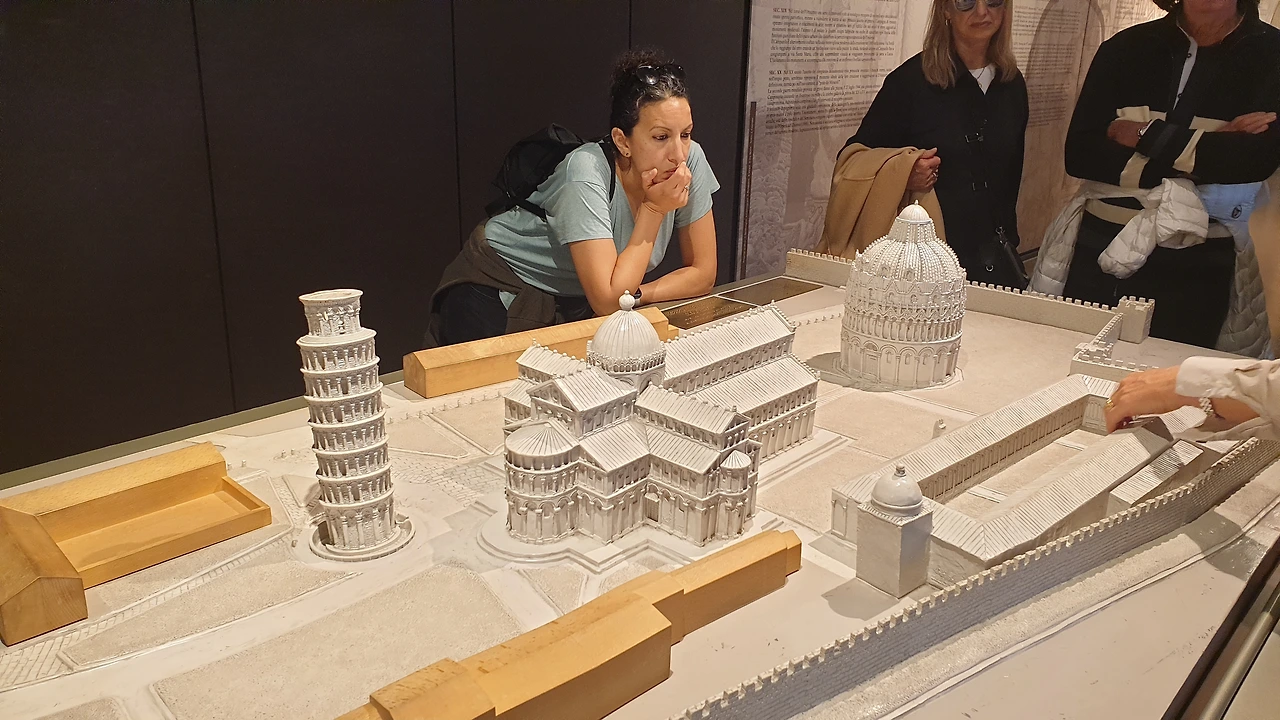 성벽 문을 지나자 둥근 돔으로 이루어진 건물과 십자가 모양의 성당, 그리고 기울어진 피사의 사탑이 보인다. 피사의 사탑은 십자가 모양 성당의 종탑으로 지어졌다. 물이었다 메워진 곳에 지어졌기 때문에 사탑 아래의 기초가 무게를 견디지 못하고 탑이 기울어졌다. 지금은 기초를 보강해 더 이상 기울어지지는 않는다. 피사의 사탑을 사진으로 촬영하는 위치에 따라 탑이 기울거나, 아니면 똑바로 선 모습으로 보이기도 한다.