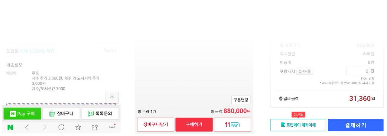아래 이미지를 보시면 이해가 쉬울 텐데요. 쿠팡이나 11번가 등도 자사의 간편 결제 서비스를 강조하긴 했지만 네이버처럼 다른 구매 버튼이 없는 경우는 없습니다.